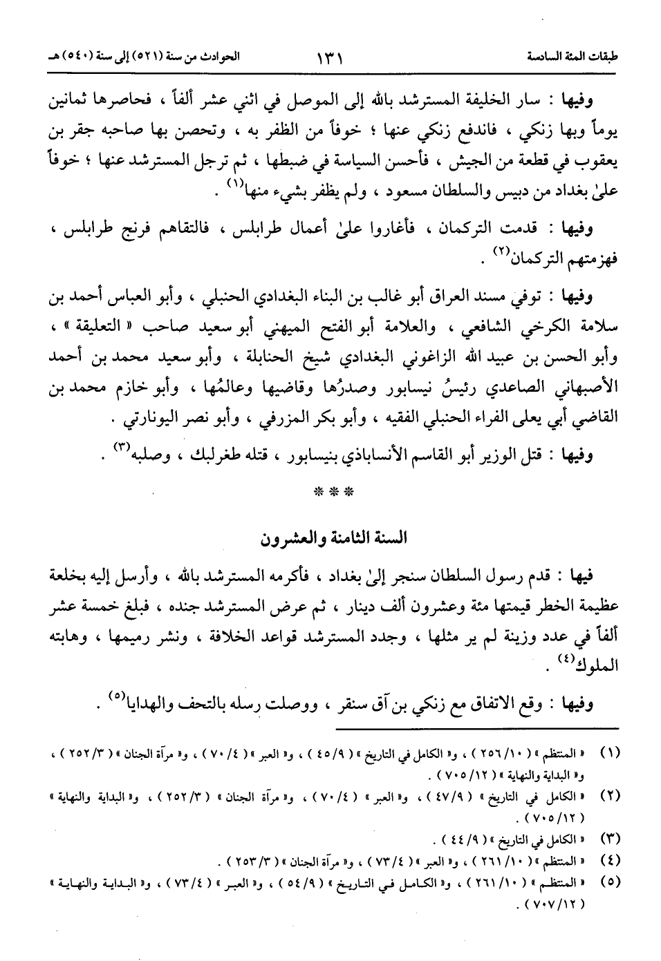 (5) «المنتظم» (10/ 261)، و «الكامل في التاريخ» (9/ 54)، و «العبر» (4/ 73)، و «البداية والنهاية» (12/ 707).