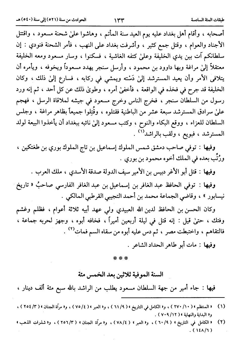 (1) «المنتظم» (10/ 270)، و «الكامل في التاريخ» (9/ 61)، و «العبر» (4/ 75)، و «مرآة الجنان» (3/ 254)، و «البداية والنهاية» (12/ 709).