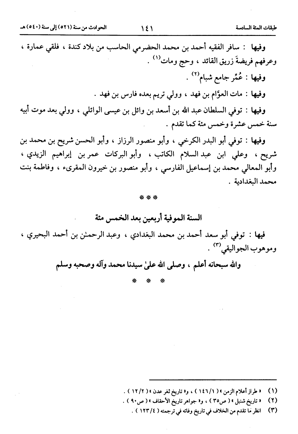 فيها: توفي أبو سعد أحمد بن محمد البغدادي، وعبد الرحمن بن أحمد البحيري، وموهوب الجواليقي (3).
