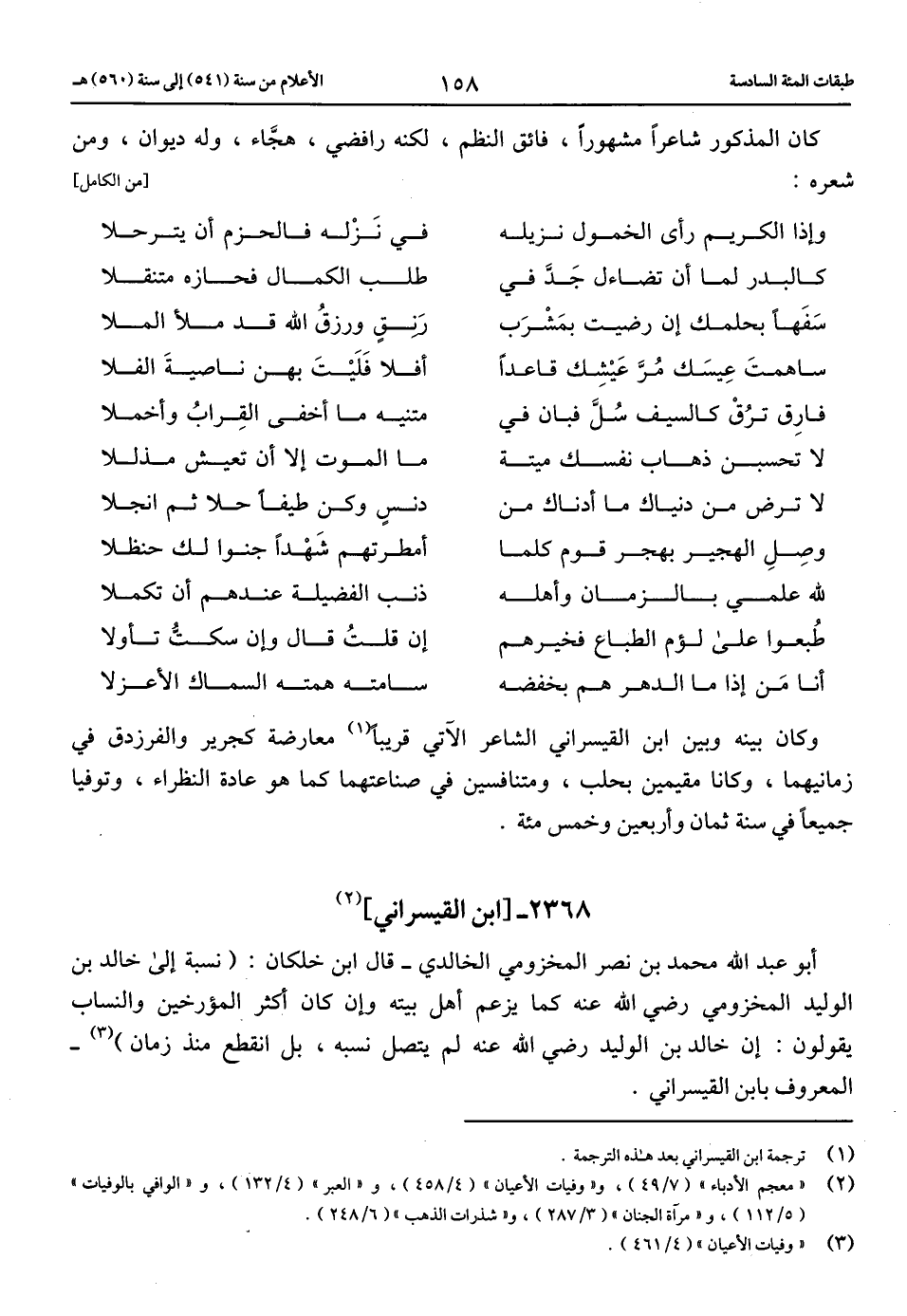 أبو عبد الله محمد بن نصر المخزومي الخالدي-قال ابن خلكان: (نسبة إلى خالد بن الوليد المخزومي رضي الله عنه كما يزعم أهل بيته وإن كان أكثر المؤرخين والنساب يقولون: إن خالد بن الوليد رضي الله عنه لم يتصل نسبه، بل انقطع منذ زمان) (3) - المعروف بابن القيسراني.