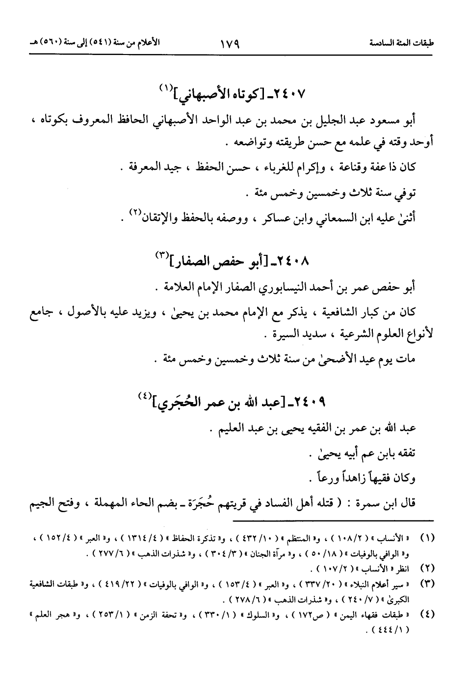 (1) «الأنساب» (2/ 108)، و «المنتظم» (10/ 432)، و «تذكرة الحفاظ» (4/ 1314)، و «العبر» (4/ 152)، و «الوافي بالوفيات» (18/ 50)، و «مرآة الجنان» (3/ 304)، و «شذرات الذهب» (6/ 277).