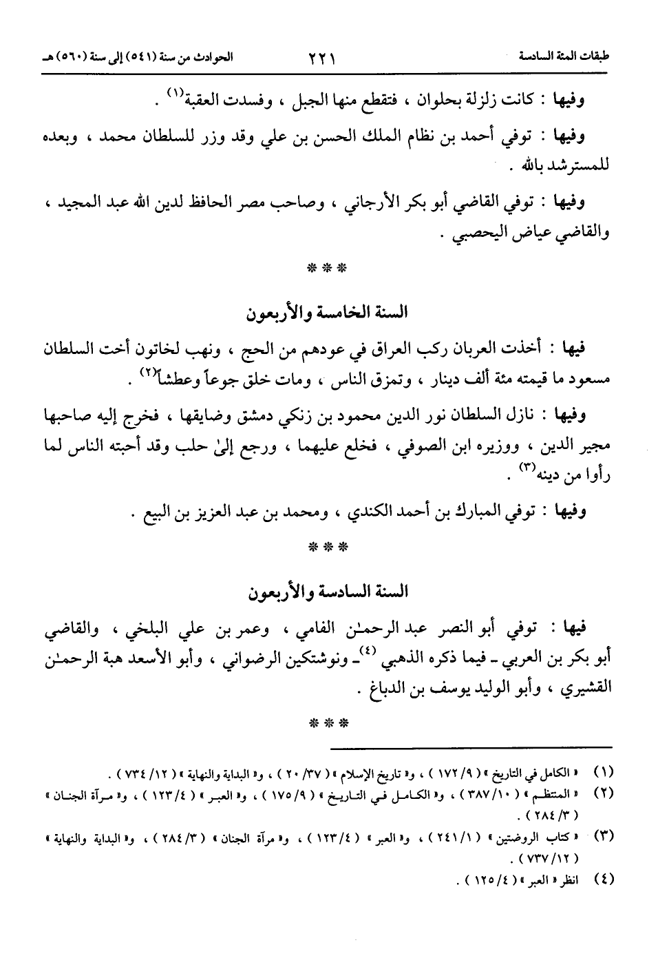 (1) «الكامل في التاريخ» (9/ 172)، و «تاريخ الإسلام» (37/ 20)، و «البداية والنهاية» (12/ 734).
