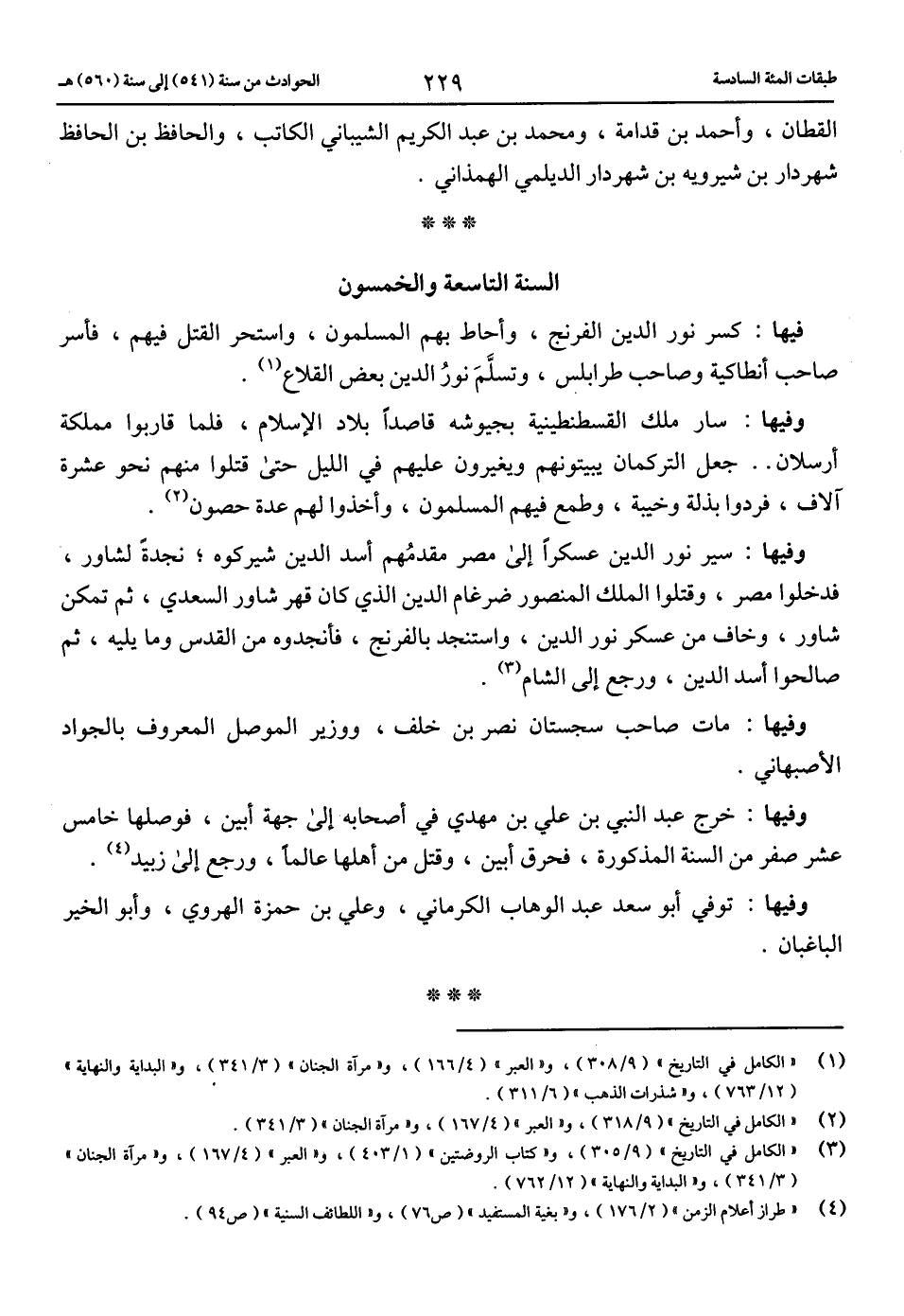 (2) «الكامل في التاريخ» (9/ 318)، و «العبر» (4/ 167)، و «مرآة الجنان» (3/ 341).