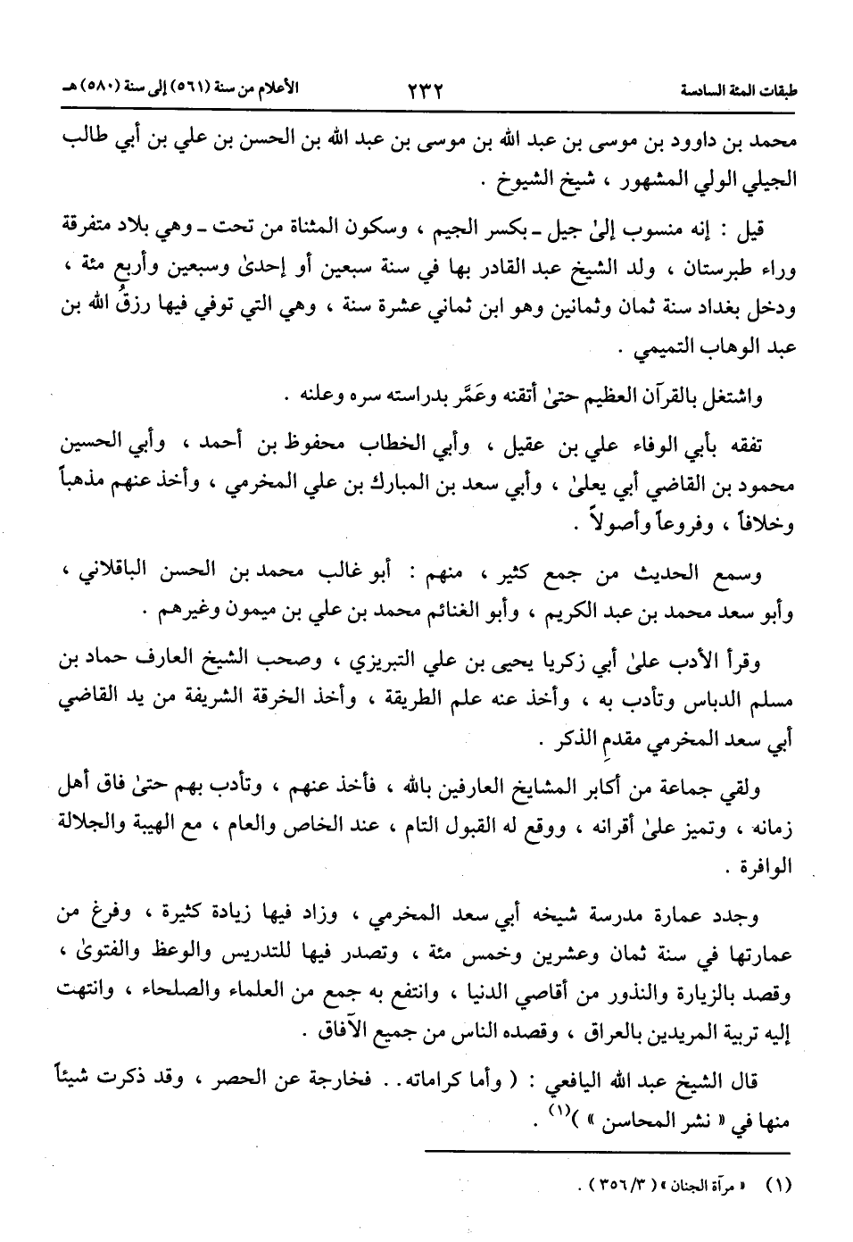 قيل: إنه منسوب إلى جيل-بكسر الجيم، وسكون المثناة من تحت-وهي بلاد متفرقة وراء طبرستان، ولد الشيخ عبد القادر بها في سنة سبعين أو إحدى وسبعين وأربع مائة، ودخل بغداد سنة ثمان وثمانين وهو ابن ثماني عشرة سنة، وهي التي توفي فيها رزق الله بن عبد الوهاب التميمي.