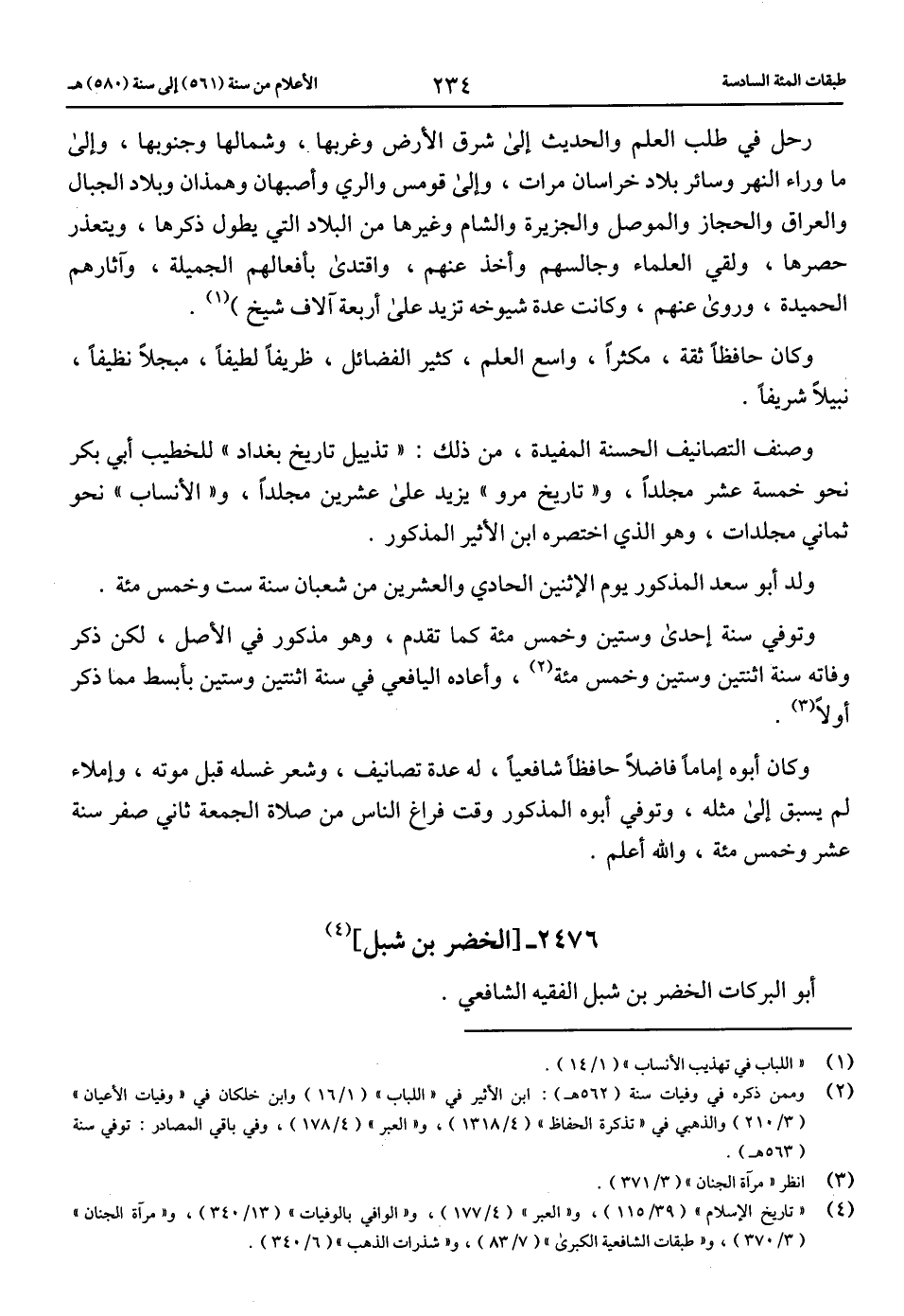 (2) وممن ذكره في وفيات سنة (562 هـ): ابن الأثير في «اللباب» (1/ 16)، وابن خلكان في «وفيات الأعيان» (3/ 210) والذهبي في «تذكرة الحفاظ» (4/ 1318)، و «العبر» (4/ 178)، وفي باقي المصادر: توفي سنة (563 هـ).