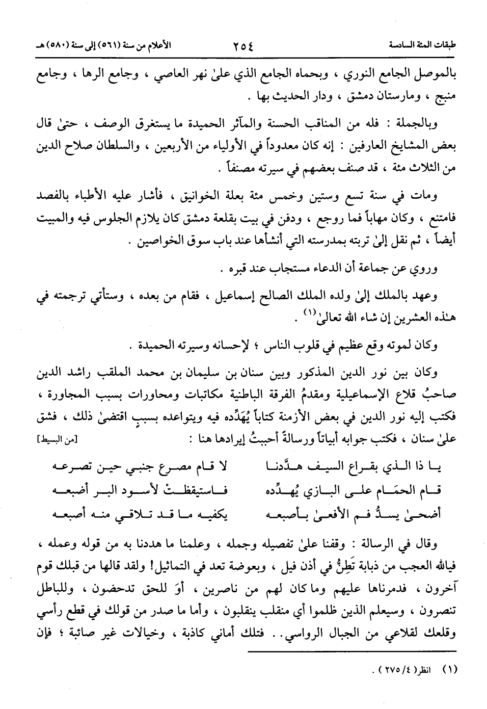 وكان بين نور الدين المذكور وبين سنان بن سليمان بن محمد الملقب راشد الدين صاحب قلاع الإسماعيلية ومقدم الفرقة الباطنية مكاتبات ومحاورات بسبب المجاورة، فكتب إليه نور الدين في بعض الأزمنة كتابا يهدّده فيه ويتواعده بسبب اقتضى ذلك، فشق على سنان، فكتب جوابه أبياتا ورسالة أحببت إيرادها هنا: [من البسيط]