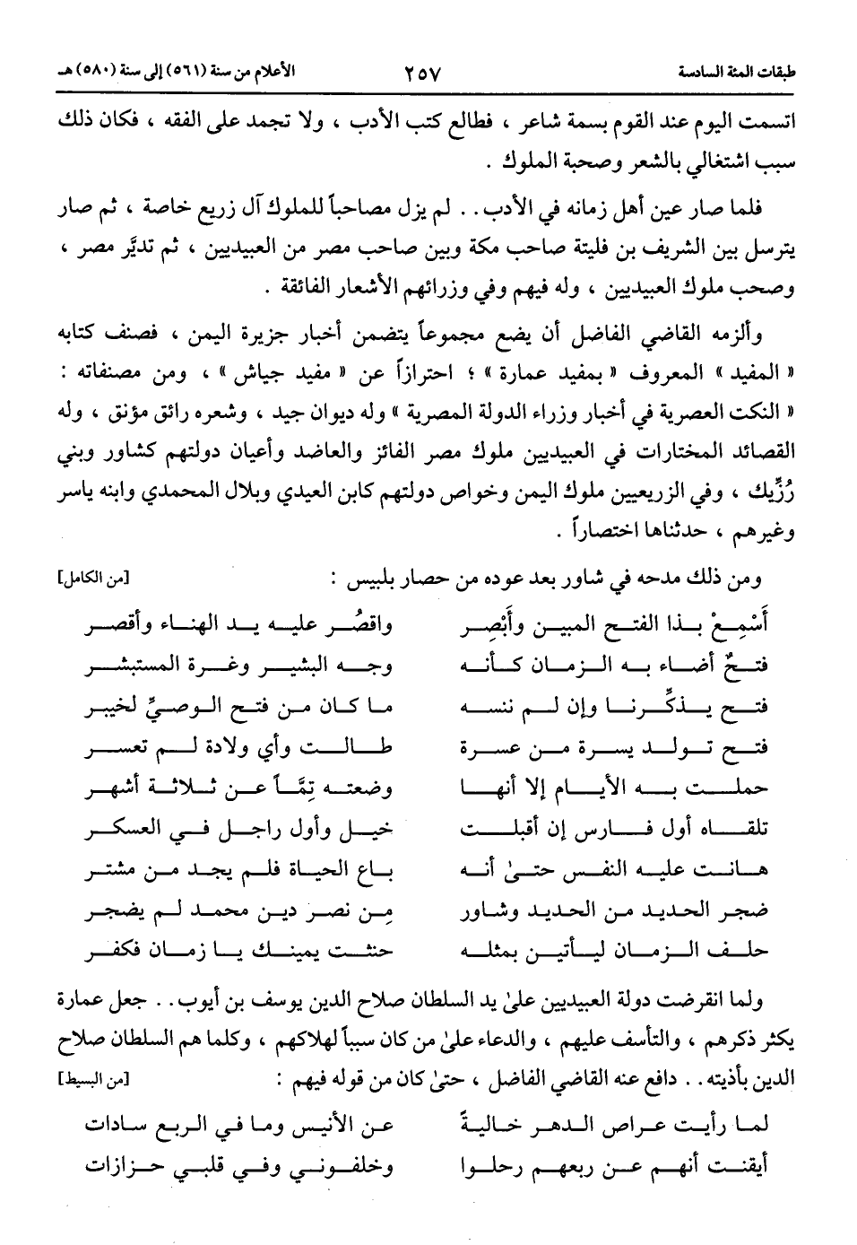 ولما انقرضت دولة العبيديين على يد السلطان صلاح الدين يوسف بن أيوب .. جعل عمارة يكثر ذكرهم، والتأسف عليهم، والدعاء على من كان سببا لهلاكهم، وكلما هم السلطان صلاح الدين بأذيته .. دافع عنه القاضي الفاضل، حتى كان من قوله فيهم: [من البسيط]