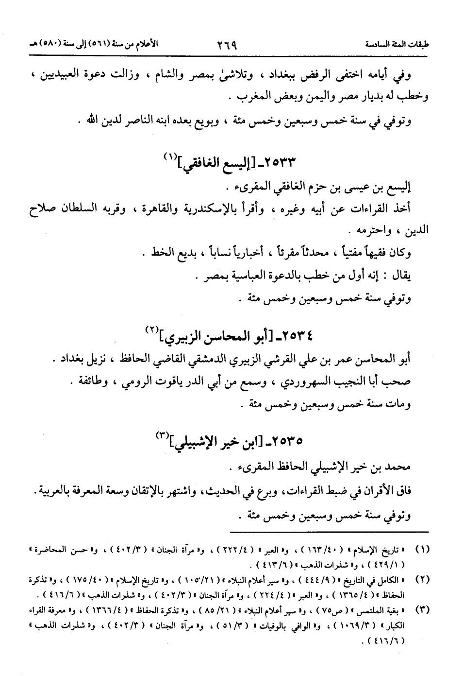 (2) «الكامل في التاريخ» (9/ 444)، و «سير أعلام النبلاء» (21/ 105)، و «تاريخ الإسلام» (40/ 175)، و «تذكرة الحفاظ» (4/ 1365)، و «العبر» (4/ 224)، و «مرآة الجنان» (3/ 402)، و «شذرات الذهب» (6/ 416).