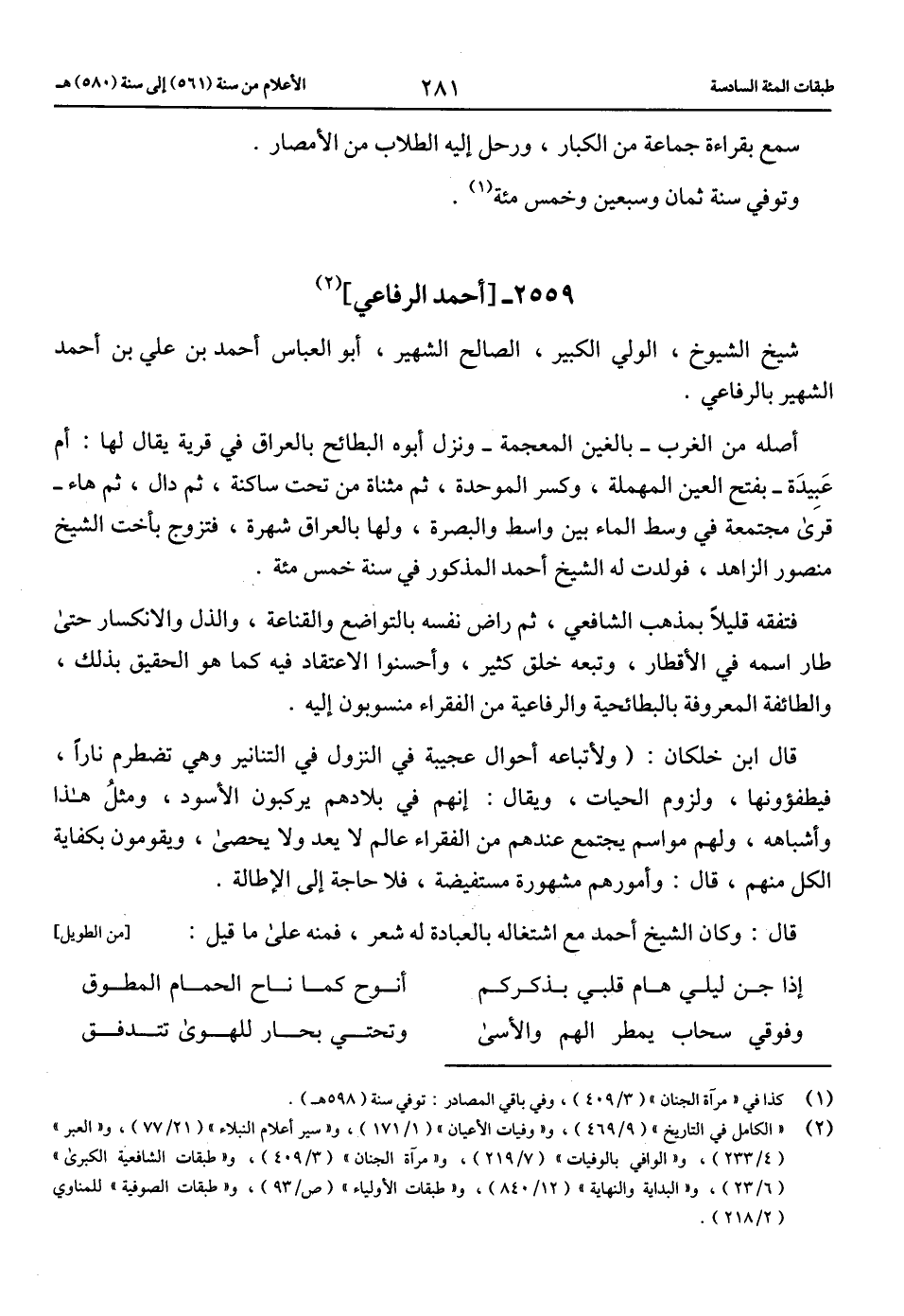 (2) «الكامل في التاريخ» (9/ 469)، و «وفيات الأعيان» (1/ 171)، و «سير أعلام النبلاء» (21/ 77)، و «العبر» (4/ 233)، و «الوافي بالوفيات» (7/ 219)، و «مرآة الجنان» (3/ 409)، و «طبقات الشافعية الكبرى» (6/ 23)، و «البداية والنهاية» (12/ 840)، و «طبقات الأولياء» (ص 93/)، و «طبقات الصوفية» للمناوي (2/ 218).