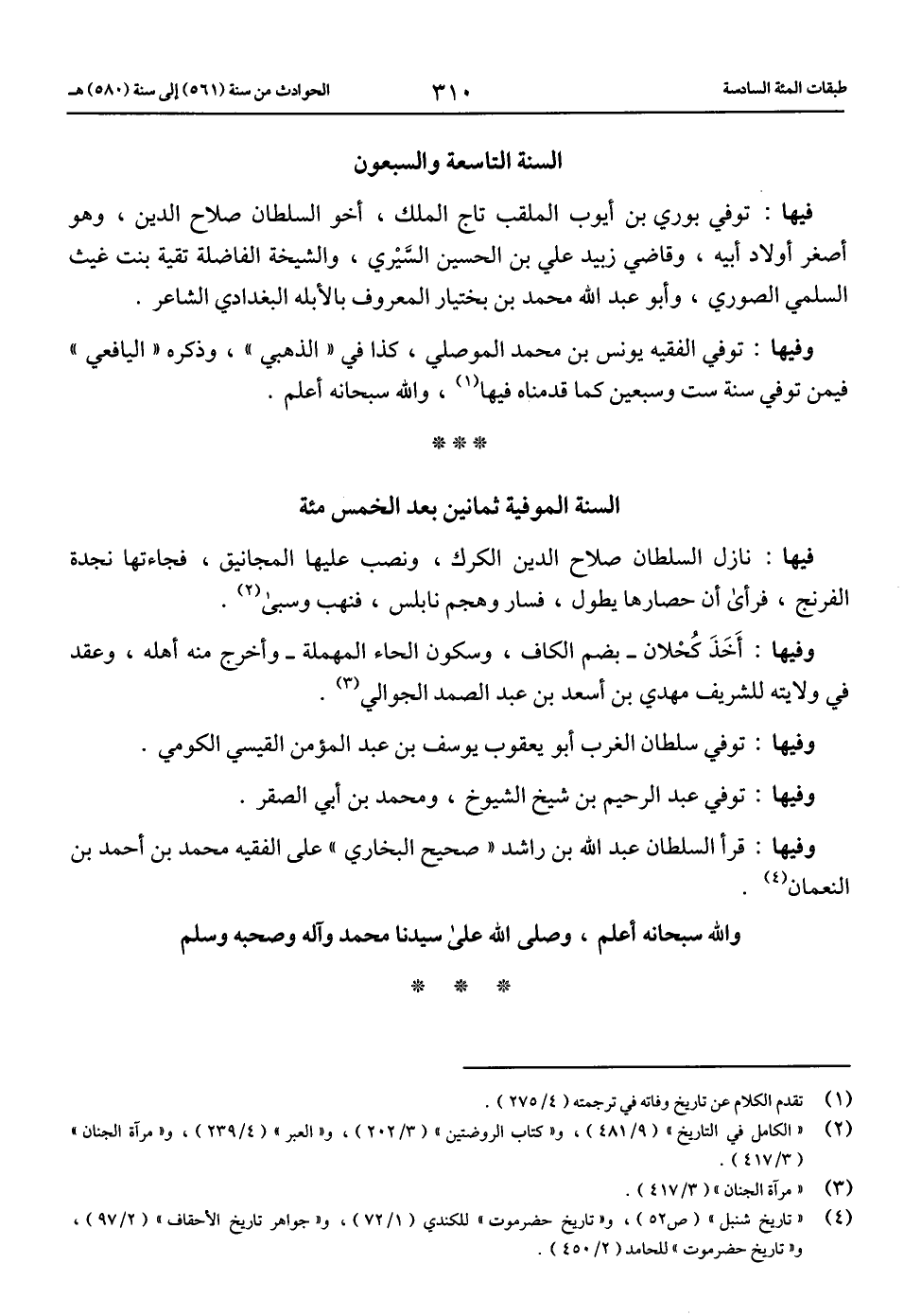 (2) «الكامل في التاريخ» (9/ 481)، و «كتاب الروضتين» (3/ 202)، و «العبر» (4/ 239)، و «مرآة الجنان» (3/ 417).