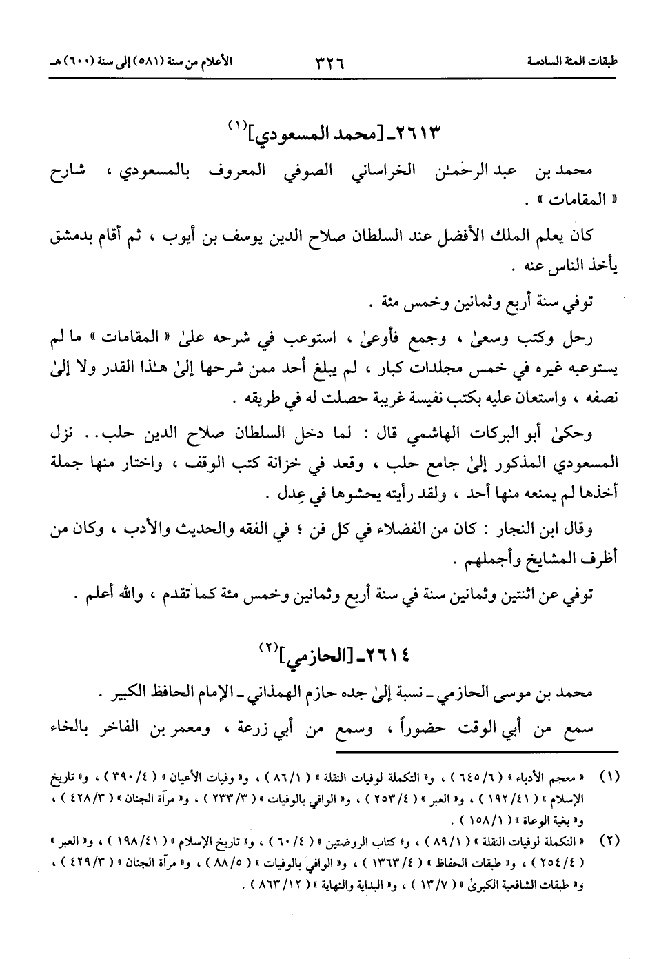 (2) «التكملة لوفيات النقلة» (1/ 89)، و «كتاب الروضتين» (4/ 60)، و «تاريخ الإسلام» (41/ 198)، و «العبر» (4/ 254)، و «طبقات الحفاظ» (4/ 1363)، و «الوافي بالوفيات» (5/ 88)، و «مرآة الجنان» (3/ 429)، و «طبقات الشافعية الكبرى» (7/ 13)، و «البداية والنهاية» (12/ 863).