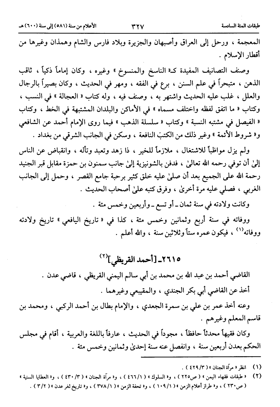 (2) «طبقات فقهاء اليمن» (ص 225)، و «السلوك» (1/ 466)، و «مرآة الجنان» (3/ 430)، و «العطايا السنية» (ص 230)، و «طراز أعلام الزمن» (1/ 109)، و «تحفة الزمن» (1/ 378)، و «تاريخ ثغر عدن» (2/ 3).