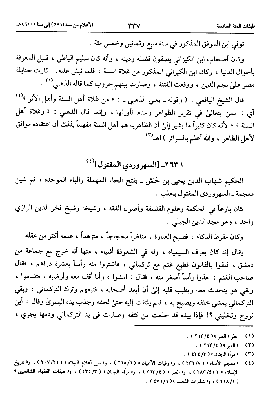(4) «معجم الأدباء» (7/ 232)، و «وفيات الأعيان» (6/ 268)، و «سير أعلام النبلاء» (21/ 207)، و «تاريخ الإسلام» (41/ 283)، و «العبر» (4/ 263)، و «مرآة الجنان» (3/ 434)، و «طبقات الفقهاء الشافعيين» (2/ 228)، و «شذرات الذهب» (6/ 476).