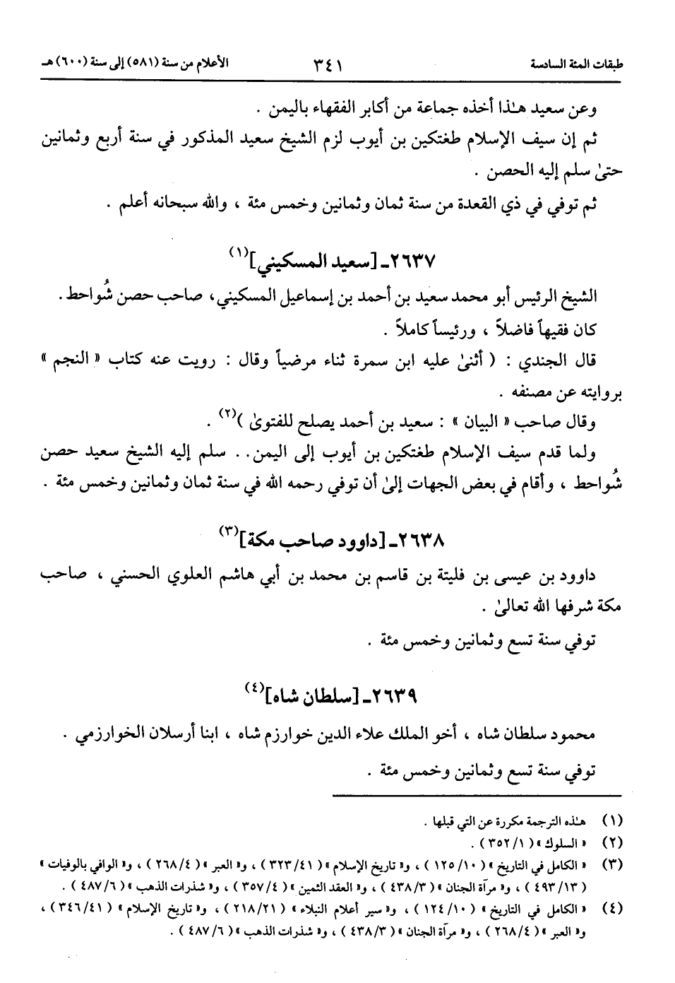 (4) «الكامل في التاريخ» (10/ 124)، و «سير أعلام النبلاء» (21/ 218)، و «تاريخ الإسلام» (41/ 346)، و «العبر» (4/ 268)، و «مرآة الجنان» (3/ 438)، و «شذرات الذهب» (6/ 487).
