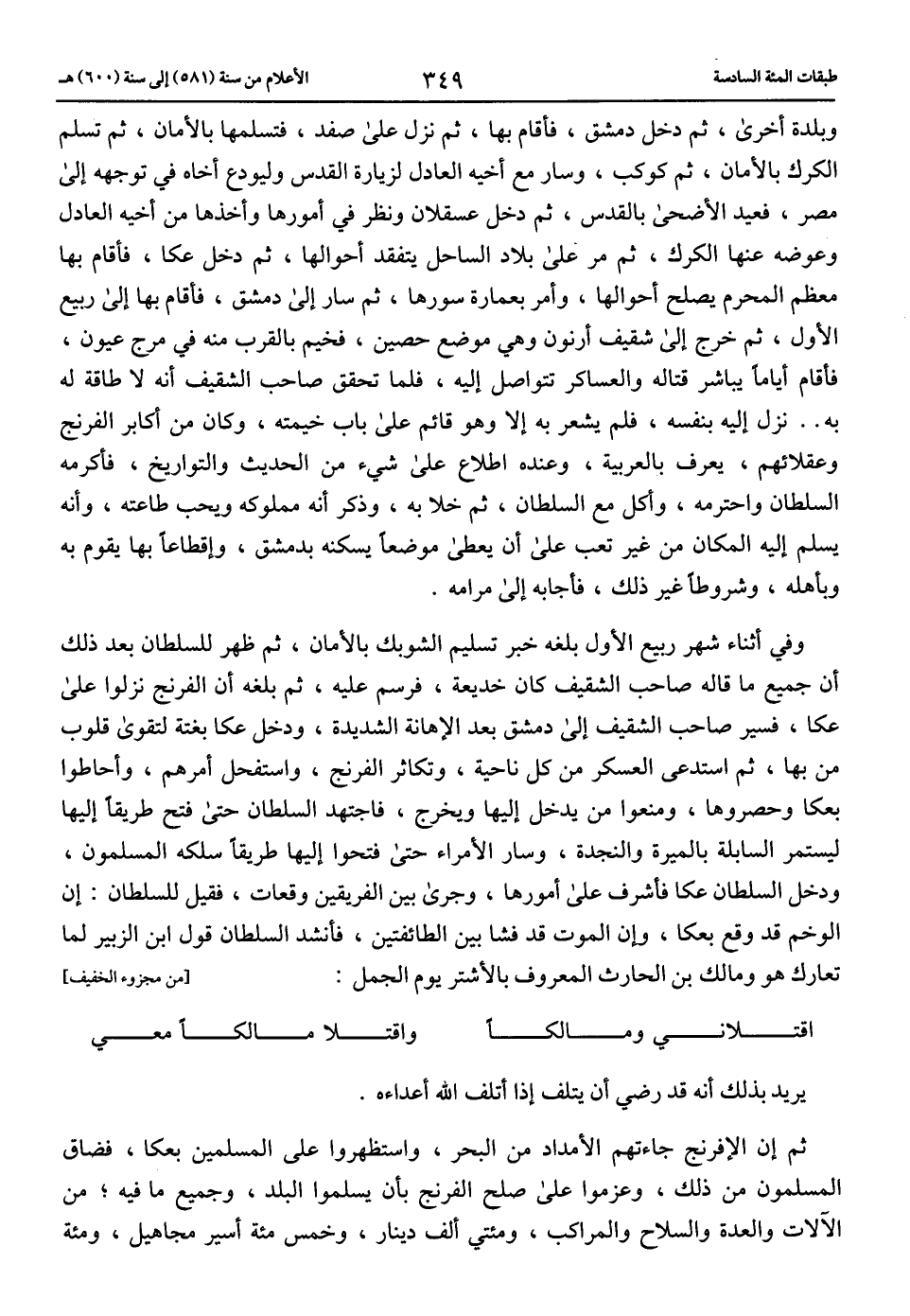 وبلدة أخرى، ثم دخل دمشق، فأقام بها، ثم نزل على صفد، فتسلمها بالأمان، ثم تسلم الكرك بالأمان، ثم كوكب، وسار مع أخيه العادل لزيارة القدس وليودع أخاه في توجهه إلى مصر، فعيد الأضحى بالقدس، ثم دخل عسقلان ونظر في أمورها وأخذها من أخيه العادل وعوضه عنها الكرك، ثم مر على بلاد الساحل يتفقد أحوالها، ثم دخل عكا، فأقام بها معظم المحرم يصلح أحوالها، وأمر بعمارة سورها، ثم سار إلى دمشق، فأقام بها إلى ربيع الأول، ثم خرج إلى شقيف أرنون وهي موضع حصين، فخيم بالقرب منه في مرج عيون، فأقام أياما يباشر قتاله والعساكر تتواصل إليه، فلما تحقق صاحب الشقيف أنه لا طاقة له به .. نزل إليه بنفسه، فلم يشعر به إلا وهو قائم على باب خميته، وكان من أكابر الفرنج وعقلائهم، يعرف بالعربية، وعنده اطلاع على شيء من الحديث والتواريخ، فأكرمه السلطان واحترمه، وأكل مع السلطان، ثم خلا به، وذكر أنه مملوكه ويحب طاعته، وأنه يسلم إليه المكان من غير تعب على أن يعطى موضعا يسكنه بدمشق، وإقطاعا بها يقوم به وبأهله، وشروطا غير ذلك، فأجابه إلى مرامه.