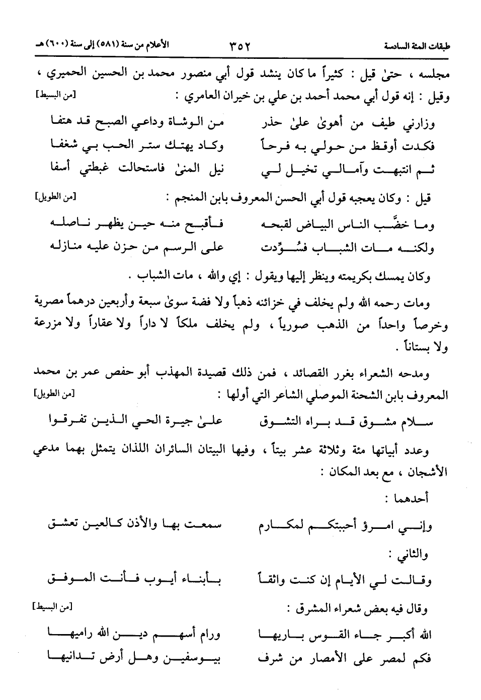 مجلسه، حتى قيل: كثيرا ما كان ينشد قول أبي منصور محمد بن الحسين الحميري، وقيل: إنه قول أبي محمد أحمد بن علي بن خيران العامري: [من البسيط]