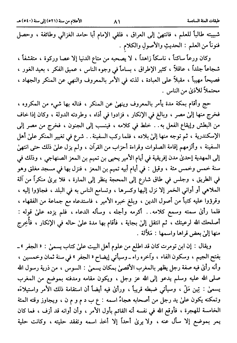 ويقال: إن ابن تومرت كان قد اطلع من علوم أهل البيت على كتاب يسمى: «الجفر» - بفتح الجيم، وسكون الفاء، وآخره راء-وسيأتي إيضاح «الجفر» في سنة ثمان وخمسين، وأنه رأى فيه صفة رجل يظهر بالمغرب الأقصى بمكان يسمى: السوس، من ذرية رسول الله صلّى الله عليه وسلم يدعو إلى الله عزّ وجل، ويكون مقامه ومدفنه بموضع من المغرب يسمى: تين ملّ، وسيأتي ضبطه قريبا، ورأى فيه أيضا أن استقامة ذلك الأمر واستيلاءه وتمكنه يكون على يد رجل من أصحابه هجاء اسمه: ع ب د م وم ن، ويجاوز وقته المائة الخامسة للهجرة، فأوقع الله في نفسه أنه القائم بأول الأمر، وأن أوانه قد أزف، فما كان يمر بموضع إلا سأل عنه، ولا يرى أحدا إلا أخذ اسمه وتفقد حليته، وكانت حلية