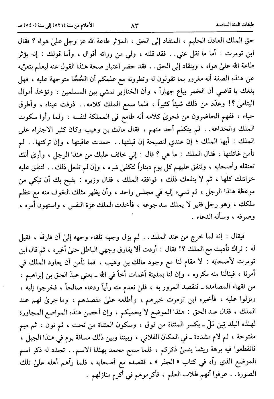 حق الملك العادل الحليم، المنقاد إلى الحق، المؤثر طاعة الله عزّ وجل على هواه؟ فقال ابن تومرت: أما ما نقل عني .. فقد قلته، ولي من ورائه أقوال، وأما قولك: إنه يؤثر طاعة الله على هواه، وينقاد إلى الحق .. فقد حضر اعتبار صحة هذا القول عنه ليعلم بتعرّيه عن هذه الصفة أنه مغرور بما تقولون له وتطرونه مع علمكم أن الحجّة متوجهة عليه، فهل بلغك يا قاضي أن الخمر يباع جهارا، وأن الخنازير تمشي بين المسلمين، وتؤخذ أموال اليتامى؟ ! وعدّد من ذلك شيئا كثيرا، فلما سمع الملك كلامه .. ذرفت عيناه، وأطرق حياء، ففهم الحاضرون من فحوى كلامه أنه طامع في المملكة لنفسه، ولما رأوا سكوت الملك وانخداعه .. لم يتكلم أحد منهم، فقال مالك بن وهيب وكان كثير الاجتراء على الملك: أيها الملك؛ إن عندي لنصيحة إن قبلتها .. حمدت عاقبتها، وإن تركتها .. لم تأمن غائلتها، فقال الملك: ما هي؟ قال: إني خائف عليك من هذا الرجل، وأرى أنك تعتقله وأصحابه، وتنفق عليهم كل يوم دينارا لتكفى شره، وإن لم تفعل ذلك .. لتنفق عليه خزائنك كلها، ثم لا ينفعك ذلك، فوافقه الملك، فقال وزيره: يقبح بك أن تبكي من موعظة هذا الرجل، ثم تسيء إليه في مجلس واحد، وأن يظهر مثلك الخوف منه مع عظم ملكك، وهو رجل فقير لا يملك سد جوعه، فأخذت الملك عزة النفس، واستهون أمره، وصرفه، وسأله الدعاء.