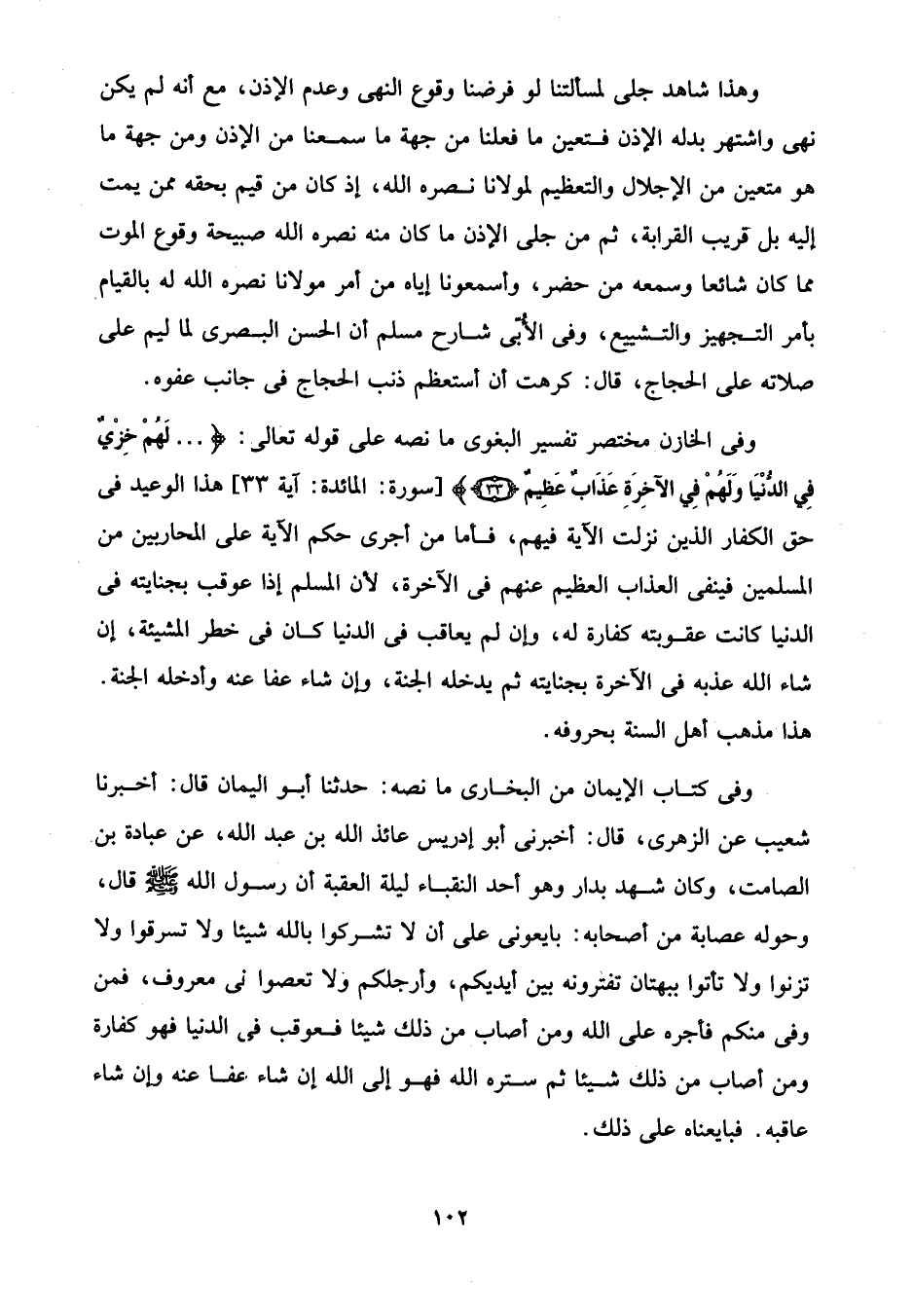 وفى كتاب الإيمان من البخارى ما نصه: حدثنا أبو اليمان قال: أخبرنا شعيب عن الزهرى، قال: أخبرنى أبو إدريس عائذ الله بن عبد الله، عن عبادة بن الصامت، وكان شهد بدار وهو أحد النقباء ليلة العقبة أن رسول الله - صلى الله عليه وسلم - قال، وحوله عصابة من أصحابه: بايعونى على أن لا تشركوا بالله شيئا ولا تسرقوا ولا تزنوا ولا تأتوا ببهتان تفترونه بين أيديكم، وأرجلكم ولا تعصوا في معروف، فمن وفى منكم فأجره على الله ومن أصاب من ذلك شيئًا فعوقب في الدنيا فهو كفارة ومن أصاب من ذلك شيئا ثم ستره الله فهو إلى الله إن شاء عفا عنه وإن شاء عاقبه. فبايعناه على ذلك.