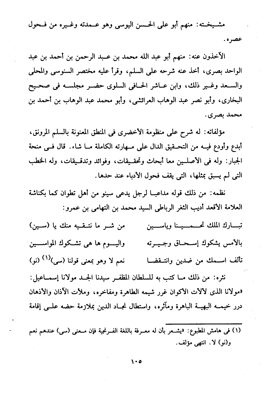 نظمه: من ذلك قوله مداعبا لرجل يدعى سينو من أهل تطوان كما بكناشة العلامة الأقعد أديب الثغر الرباطى السيد محمد بن التهامي بن عمرو: