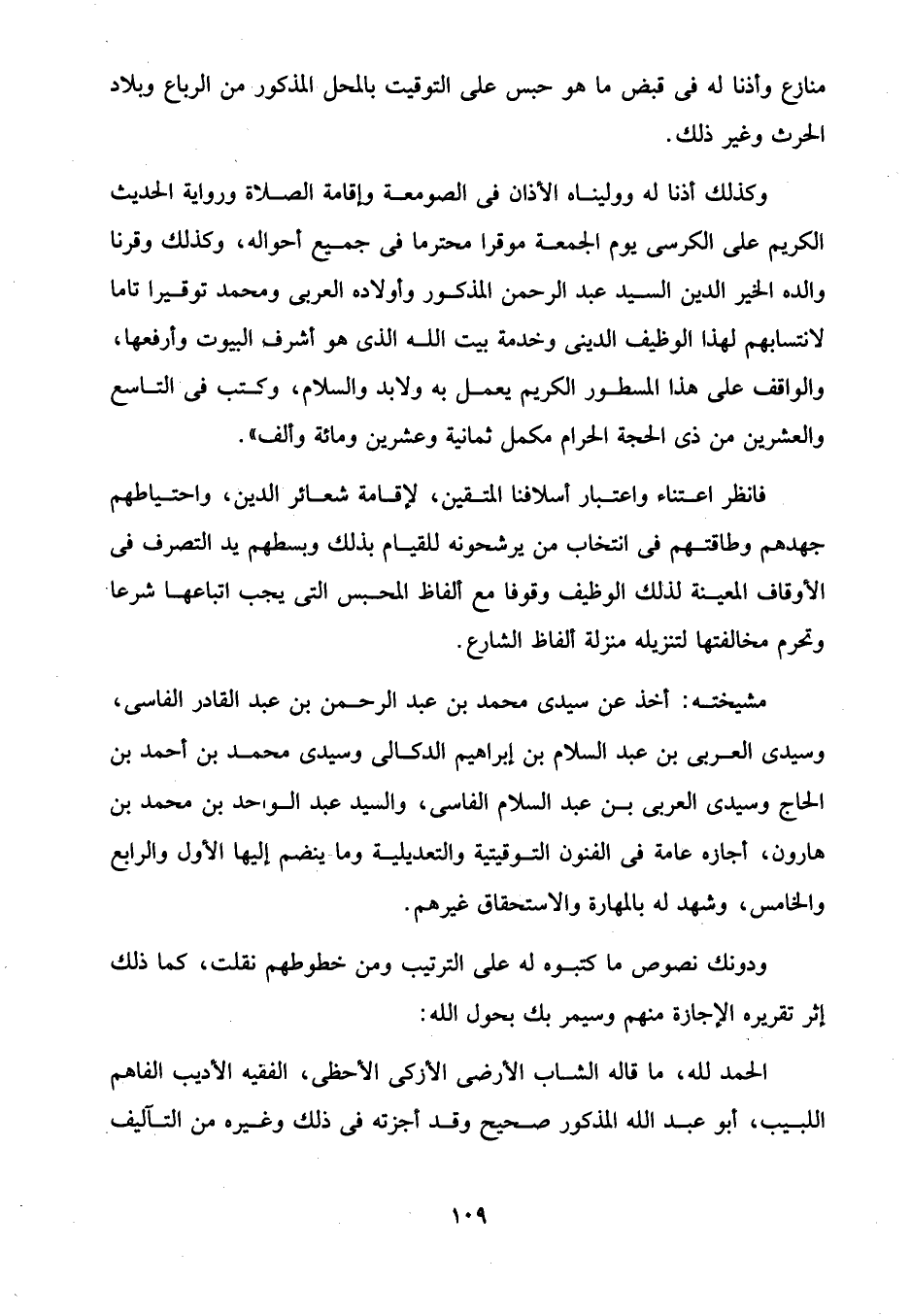 وكذلك أذنا له ووليناه الأذان في الصومعة وإقامة الصلاة ورواية الحديث الكريم على الكرسى يوم الجمعة موقرا محترما في جميع أحواله، وكذلك وقرنا والده الخير الدين السيد عبد الرحمن المذكور وأولاده العربى ومحمد توقيرا تاما لانتسابهم لهذا الوظيف الدينى وخدمة بيت الله الذى هو أشرف البيوت وأرفعها، والواقف على هذا المسطور الكريم يعمل به ولابد والسلام، وكتب في التاسع والعشرين من ذى الحجة الحرام مكمل ثمانية وعشرين ومائة وألف".
