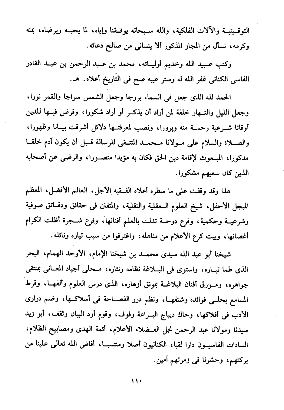 شيخنا أبو عبد الله سيدى محمد بن شيخنا الإمام، الأوحد الهمام، البحر الذى طما تياره، واستوى في البلاغة نظامه ونثاره، محلى أجياد المعانى بمنتقى جواهره، ومورق أفنان البلاغة بمونق أزهاره، الذى درس العلوم وألفها، وقرط المسامع بحلى فوائده وشنفها، ونظم درر الفصاحة في أسلاكها، وضم درارى الأدب في أفلاكها، وحاك ديباج البراءة وفوف، وقوم أود البيان وثقف، أبو زيد سيدنا ومولانا عبد الرحمن نجل الفضلاء الأعلام، أئمة الهدى ومصابيح الظلام، السادات الفاسيون دارا لقبا، الكنانيون أصلا ومنتسبا، أفاض الله تعالى علينا من بركتهم، وحشرنا في زمرتهم آمين.