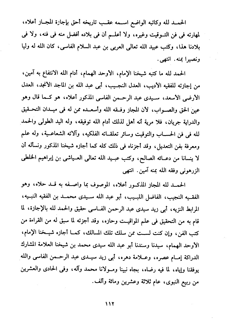 الحمد لله وكاتبه الواضع اسمه عقب تاريخه أحق بإجازة المجاز أعلاه، لمهارته في فن التوقيت وغيره، ولا أعلم أن في بلاده أفضل منه في فنه، ولا في بلادنا هذا، وكتب عبيد الله تعالى العربي بن عبد السلام الفاسى، كان الله له وليا ونصيرا بمنه. انتهى.