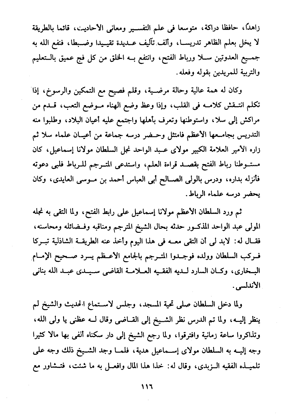 ثم ورد السلطان الأعظم مولانا إسماعيل على رابط الفتح، ولما التقى به نجله المولى عبد الواحد المذكور حدثه بحال الشيخ المترجم ومناقبه وفضائله ومحاسنه، فقال له: لابد لى أن التقى معه في هذا اليوم وأخذ عنه الطريقة الشاذلية تبركا فركب السلطان وولده فوجدوا المترجم بالجامع الأعظم يسرد صحيح الإمام البخارى، وكان السارد لديه الفقيه العلامة القاضى سيدى عبد الله بنانى الأندلسى.