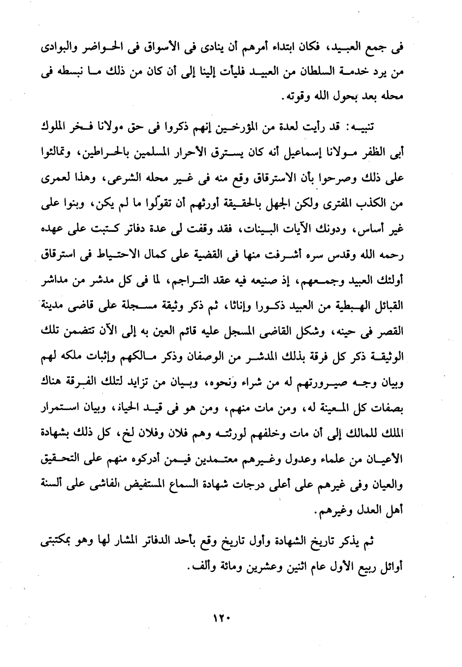 تنبيه: قد رأيت لعدة من المؤرخين إنهم ذكروا في حق مولانا فخر الملوك أبي الظفر مولانا إسماعيل أنه كان يسترق الأحرار المسلمين بالحراطين، وتمالئوا على ذلك وصرحوا بأن الاسترقاق وقع منه في غير محله الشرعى، وهذا لعمرى من الكذب المفترى ولكن الجهل بالحقيقة أورثهم أن تقوّلوا ما لما يكن، وبنوا على غير أساس، ودونك الآيات البينات، فقد وقفت لى عدة دفاتر كتبت على عهده رحمه الله وقدس سره أشرفت منها في القضية على كمال الاحتياط في استرقاق أولئك العبيد وجمعهم، إذ صنيعه فيه عقد التراجم، لما في كل مدشر من مداشر القبائل الهبطية من العبيد ذكورا وإناثا، ثم ذكر وثيقة مسجلة على قاضى مدينة القصر في حينه، وشكل القاضى المسجل عليه قائم العين به إلى الآن تتضمن تلك الوثيقة ذكر كل فرقة بذلك المدشر من الوصفان وذكر مالكهم وإثبات ملكه لهم وبيان وجه صيرورتهم له من شراء ونحوه، وبيان من تزايد لتلك الفرقة هناك بصفات كل المعينة له، ومن مات منهم، ومن هو في قيد الحياة، وبيان استمرار الملك للمالك إلى أن مات وخلفهم لورثته وهم فلان وفلان لخ، كل ذلك بشهادة الأعيان من علماء وعدول وغيرهم معتمدين فيمن أدركوه منهم على التحقيق والعيان وفى غيرهم على أعلى درجات شهادة السماع المستفيض الفاشى على ألسنة أهل العدل وغيرهم.