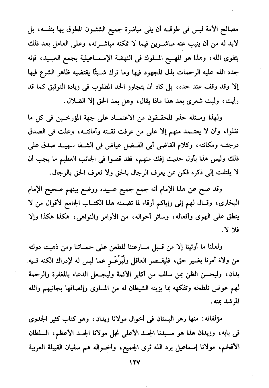 مصالح الأمة ليس في طوقه أن يلى مباشرة جميع الشئون المطوق بها بنفسه، بل لابد له من أن ينيب عنه مباشرين فيما لا تمكنه مباشرته، وعلى العامل بعد ذلك بتقوى الله، وهذا هو المهيع المسلوك في النهضة الإسماعيلية بجمع العبيد، فإنه جدد الله عليه الرحمات بذل المجهود فيها وما ترك شيئًا يقتضيه ظاهر الشرع فيها إلا وقد وقف عند حده، بل كاد أن يتجاوز الحد المطلوب في زيادة التوثيق كما قد رأيت، وليت شعري بعد هذا ماذا يقال، وهل بعد الحق إلا الضلال.