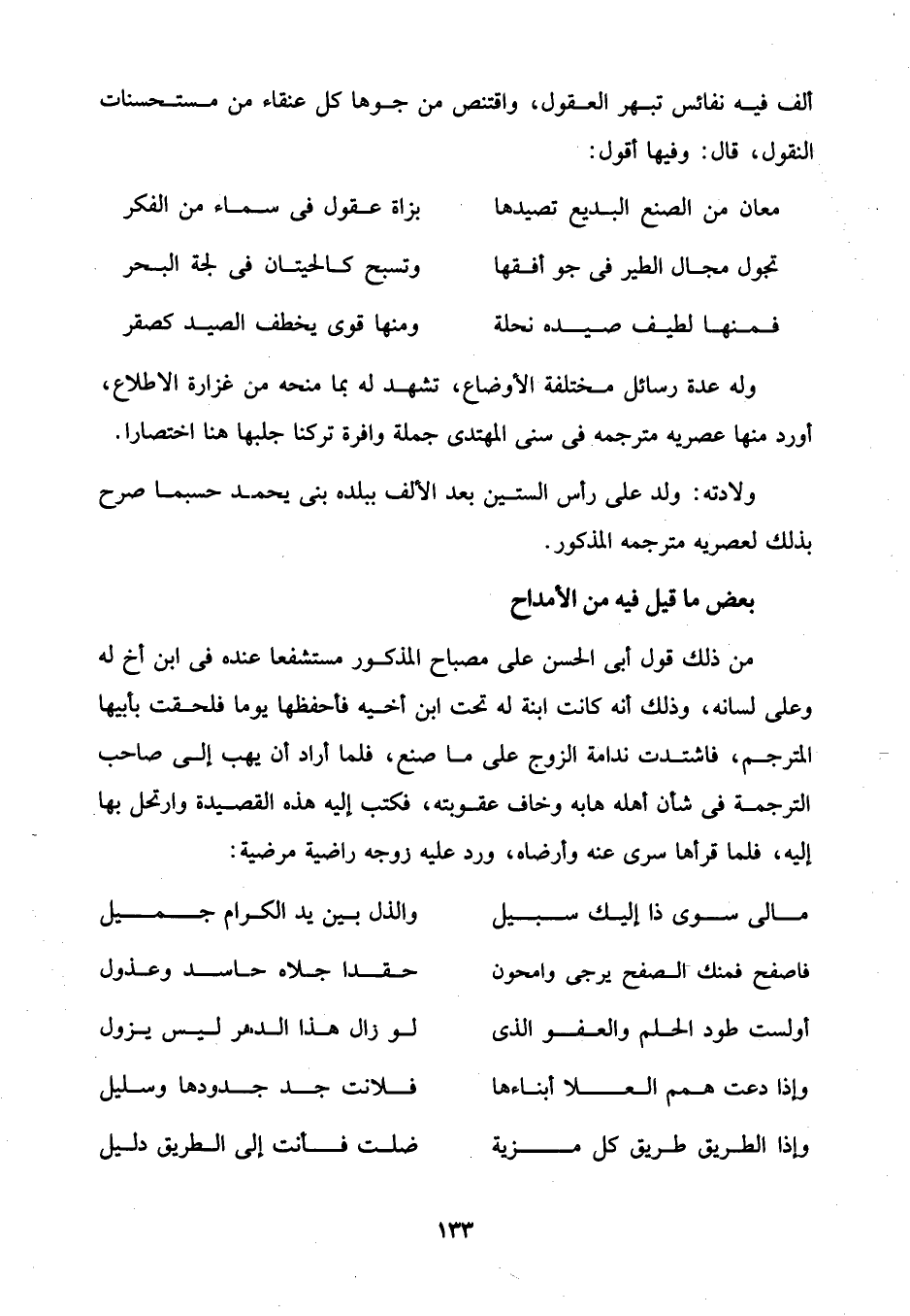 من ذلك قول أبى الحسن على مصباح المذكور مستشفعا عنده في ابن أخ له وعلى لسانه، وذلك أنه كانت ابنة له تحت ابن أخيه فأحفظها يوما فلحقت بأبيها المترجم، فاشتدت ندامة الزوج على ما صنع، فلما أراد أن يهب إلى صاحب الترجمة في شأن أهله هابه وخاف عقوبته، فكتب إليه هذه القصيدة وارتحل بها إليه، فلما قرأها سرى عنه وأرضاه، ورد عليه روجه راضية مرضية: