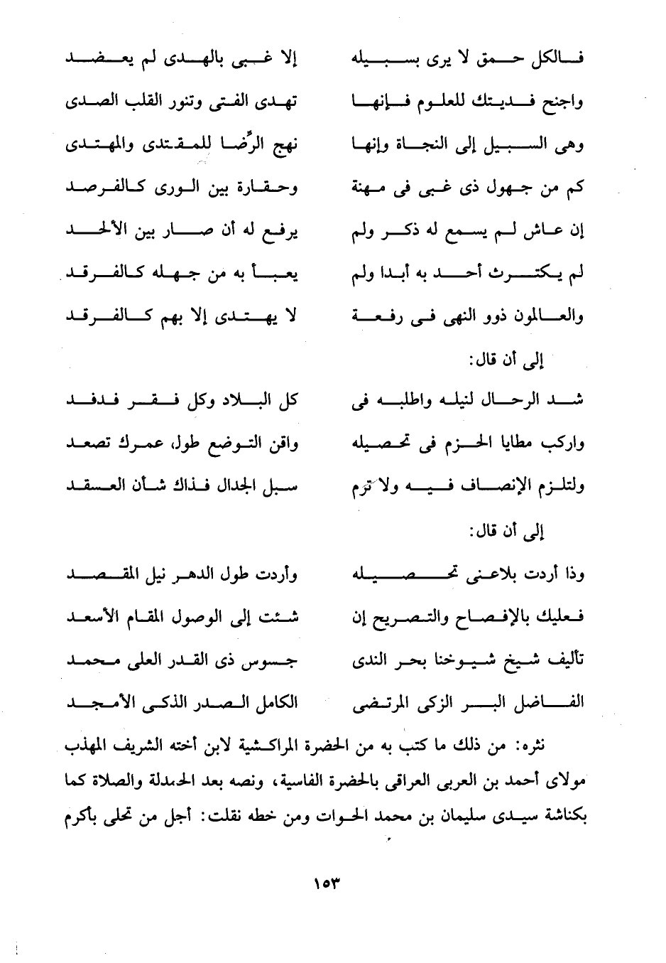 نثره: من ذلك ما كتب به من الحضرة المراكشية لابن أخته الشريف المهذب مولاى أحمد بن العربى العراقى بالحضرة الفاسية، ونصه بعد الحمدلة والصلاة كما بكناشة سيدي سليمان بن محمَّد الحوات ومن خطه نقلت: أجل من تحلى بأكرم