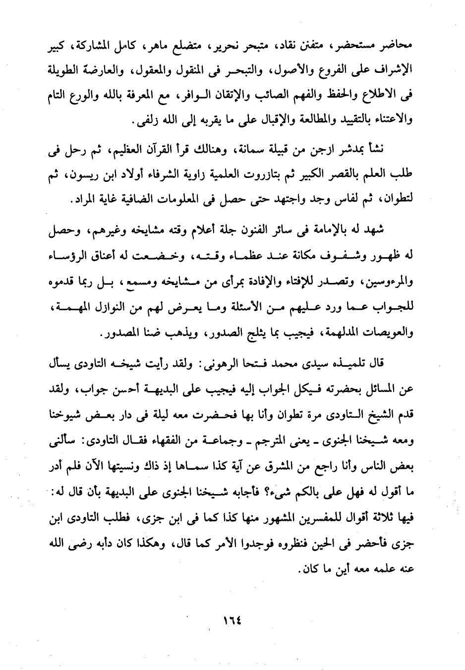 قال تلميذه سيدي محمَّد فتحا الرهونى: ولقد رأيت شيخه التاودى يسأل عن المسائل بحضرته فيكل الجواب إليه فيجيب على البديهة أحسن جواب، ولقد قدم الشيخ التاودى مرة تطوان وأنا بها فحضرت معه ليلة في دار بعض شيوخنا ومعه شيخنا الجنوى -يعني المترجم - وجماعة من الفقهاء فقال التاودى: سألنى بعض الناس وأنا راجع من المشرق عن آية كذا سماها إذ ذاك ونسيتها الآن فلم أدر ما أقول له فهل على بالكم شيء؟ فأجابه شيخنا الجنوى على البديهة بأن قال له: فيها ثلاثة أقوال للمفسرين المشهور منها كذا كما في ابن جزى، فطلب التاودى ابن جزى فأحضر في الحين فنظروه فوجدوا الأمر كما قال، وهكذا كان دأبه -رضي الله عنه - علمه معه أين ما كان.