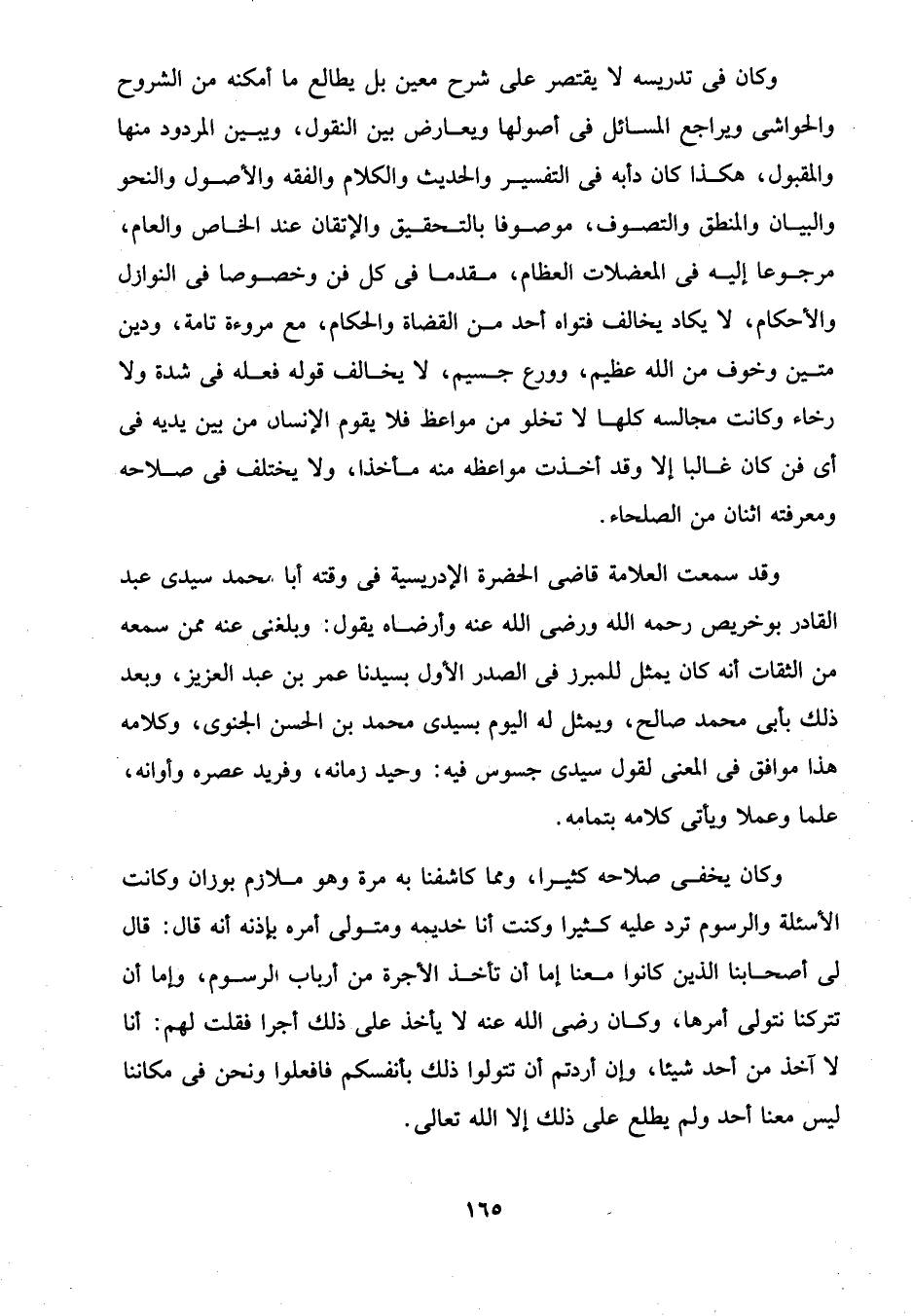 وكان في تدريسه لا يقتصر على شرح معين بل يطالع ما أمكنه من الشروح والحواشى ويراجع المسائل في أصولها ويعارض بين النقول، ويبين المردود منها والمقبول، هكذا كان دأبه في التفسير والحديث والكلام والفقه والأصول والنحو والبيان والمنطق والتصوف، موصوفا بالتحقيق والإتقان عند الخاص والعام، مرجوعا إليه في المعضلات العظام، مقدما في كل فن وخصوصا في النوازل والأحكام، لا يكاد يخالف فتواه أحد من القضاة والحكام، مع مروءة تامة، ودين متين وخوف من الله عظيم، وورع جسيم، لا يخالف قوله فعله في شدة ولا رخاء وكانت مجالسه كلها لا تخلو من مواعظ فلا يقوم الإنسان من بين يديه في أي فن كان غالبا إلا وقد أخذت مواعظه منه مأخذا، ولا يختلف في صلاحه ومعرفته اثنان من الصلحاء.