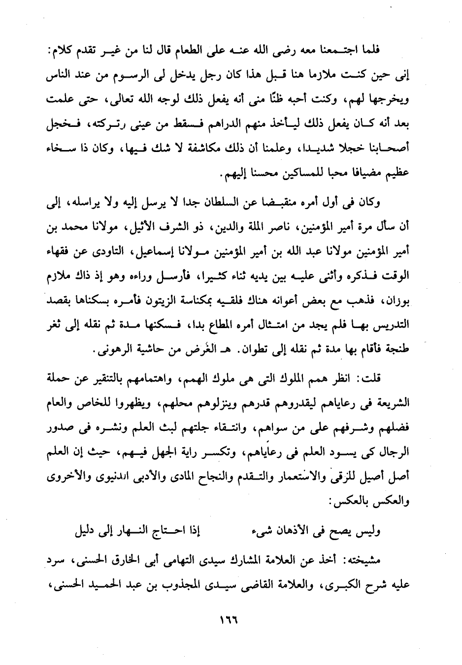 قلت: انظر همم الملوك التي هى ملوك الهمم، واهتمامهم بالتنقير عن حملة الشريعة في رعاياهم ليقدروهم قدرهم وينزلوهم محلهم، ويظهروا للخاص والعام فضلهم وشرفهم على من سواهم، وانتقاء جلتهم لبث العلم ونشره في صدور الرجال كى يسود العلم في رعاياهم، وتكسر راية الجهل فيهم، حيث إن العلم أصل أصيل للرقى والاستعمار والتقدم والنجاح المادى والأدبى الدنيوى والأخروى والعكس بالعكس: