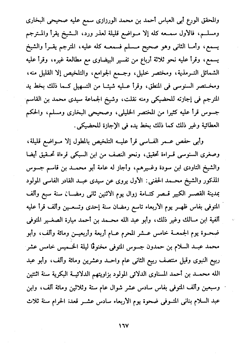 والمحقق الورع أبى العباس أحمد بن محمَّد الورزازى سمع عليه صحيحى البخاري ومسلم، فالأول سمعه كله إلا مواضع قليلة لعذر ورد، الشيخ يقرأ والمترجم يسمع، وأما الثاني وهو صحيح مسلم فسمعه كله عليه، المترجم يقرأ والشيخ يسمع، وقرأ عليه نحو ثلاثة أرباع من تفسير البيضاوى مع مطالعة غيره، وقرأ عليه الشمائل الترمذية، ومختصر خليل، وجمع الجوامع، والتلخيص إلا القليل منه، ومختصر السنوسى في المنطق، وقرأ عليه شيئاً من التسهيل كما ذلك بخط يد المترجم في إجازته للحضيكى ومنه نقلت، وشيخ الجماعة سيدي محمَّد بن القاسم. جسوس قرأ عليه كثيرا من المختصر الخليلى، وصحيحى البخاري ومسلم، والحكم العطائية وغير ذلك كما ذلك بخط يده في الإجازة للحضيكى.