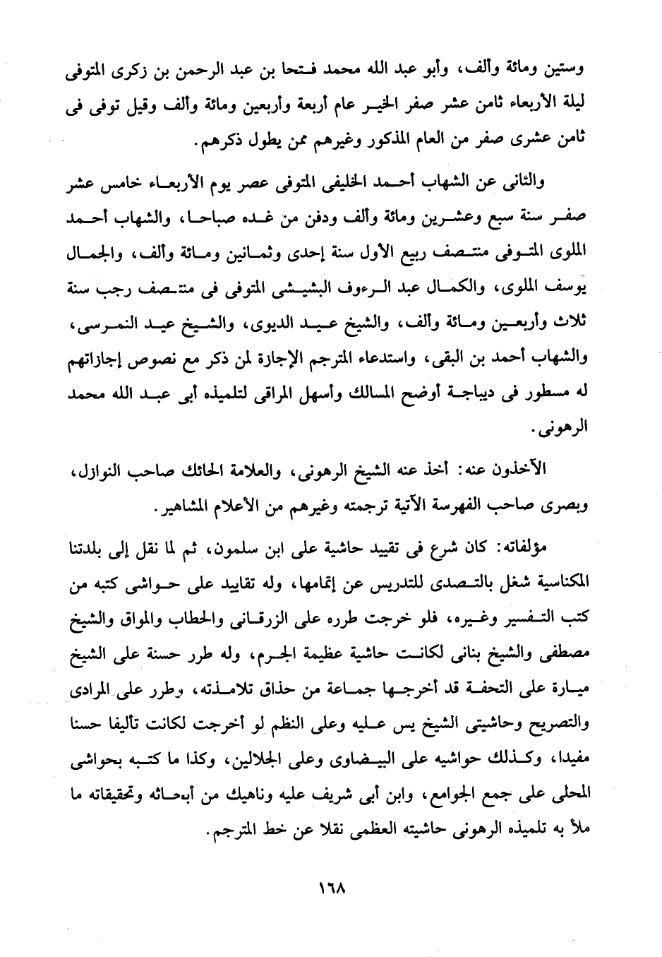 والثانى عن الشهاب أحمد الخليفى المتوفى عصر يوم الأربعاء خامس عشر صفر سنة سبع وعشرين ومائة وألف ودفن من غده صباحا، والشهاب أحمد الملوى المتوفى منتصف ربيع الأوَّل سنة إحدى وثمانين ومائة وألف، والجمال يوسف الملوى، والكمال عبد الرءوف البشيشى المتوفى في منتصف رجب سنة ثلاث وأربعين ومائة وألف، والشيخ عيد الديوى، والشيخ عيد النمرسى، والشهاب أحمد بن البقى، واستدعاء المترجم الإجازة لمن ذكر مع نصوص إجازاتهم له مسطور في ديباجة أوضح المسالك وأسهل المراقى لتلميذه أبى عبد الله محمَّد الرهونى.