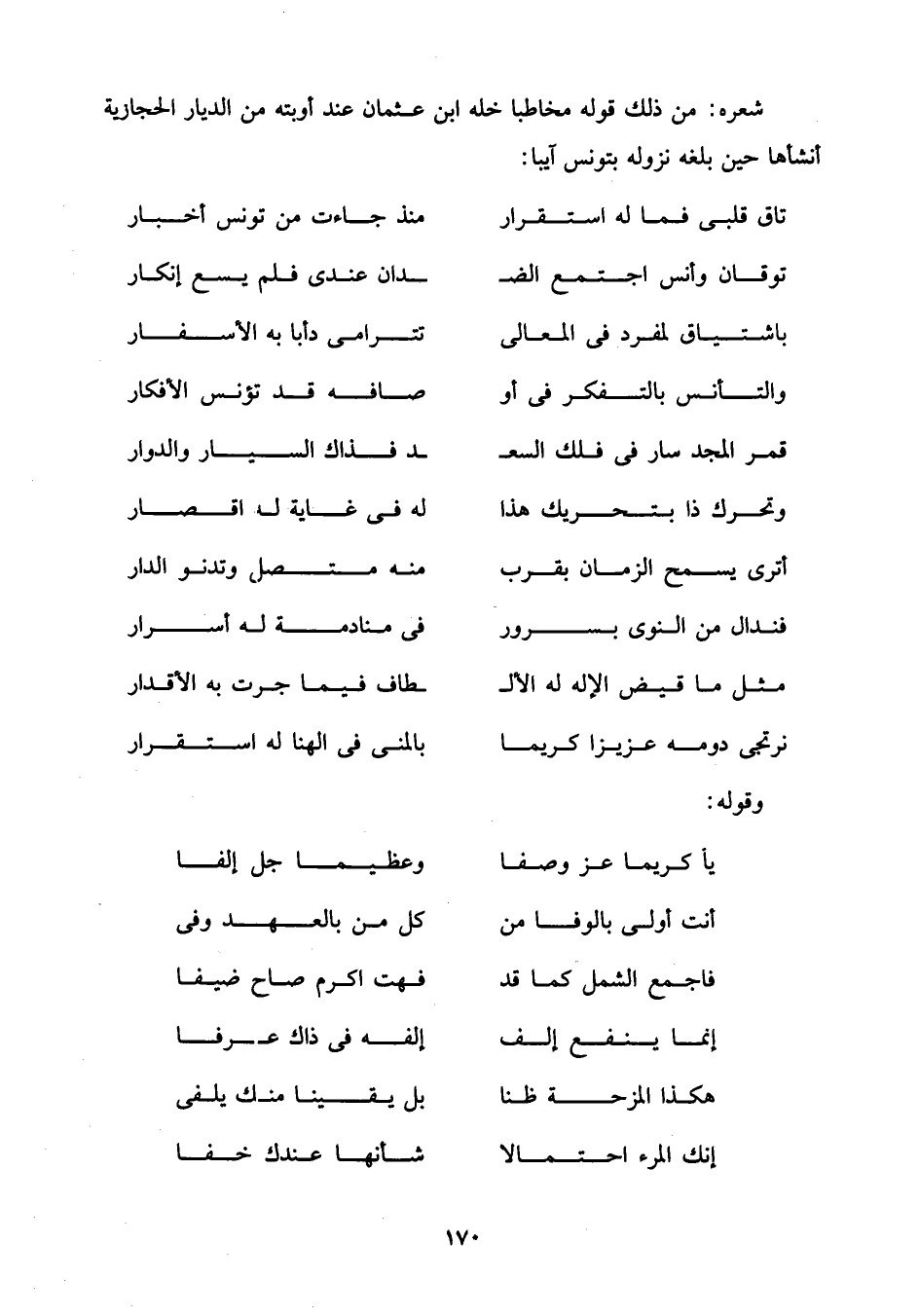 شعره: من ذلك قوله مخاطبا خله ابن عثمان عند أوبته من الديار الحجازية أنشأها حين بلغه نزوله بتونس آيبا: