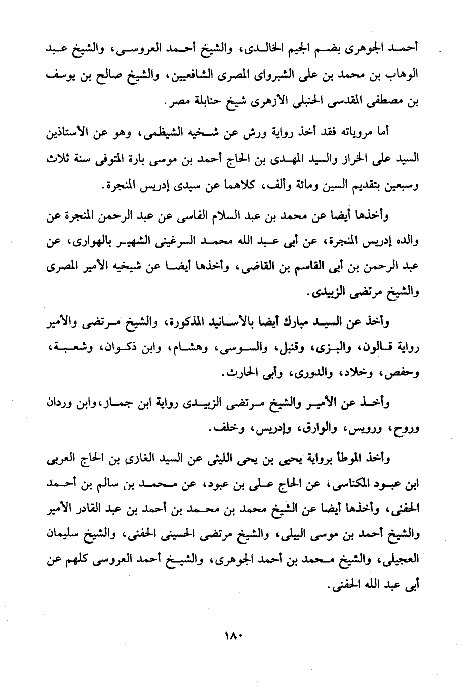 وأخذها أيضاً عن محمَّد بن عبد السلام الفاسى عن عبد الرحمن المنجرة عن والده إدريس المنجرة، عن أبى عبد الله محمَّد السرغينى الشهير بالهوارى، عن عبد الرحمن بن أبي القاسم بن القاضى، وأخذها أيضاً عن شيخيه الأمير المصرى والشيخ مرتضى الزبيدى.
