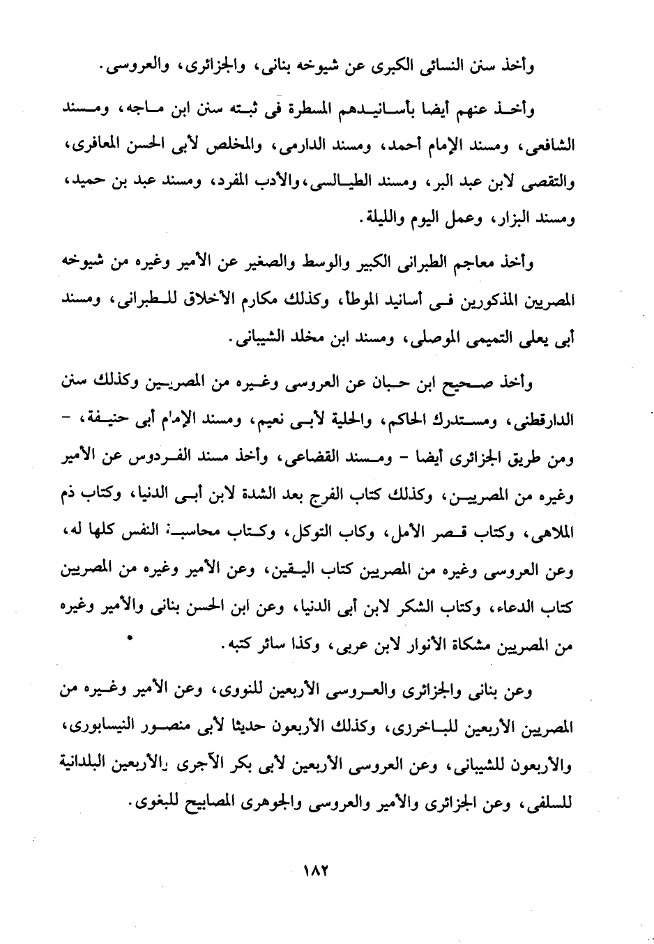 وعن بنانى والجزائرى والعروسى الأربعين للنووى، وعن الأمير وغيره من المصريين الأربعين للباخرزى، وكذلك الأربعون حديثا لأبى منصور النيسابورى، والأربعون للشيبانى، وعن العروسى الأربعين لأبي بكر الآجرى والأربعين البلدانية للسلفى، وعن الجزائرى والأمير والعروسى والجوهرى المصابيح للبغوى.