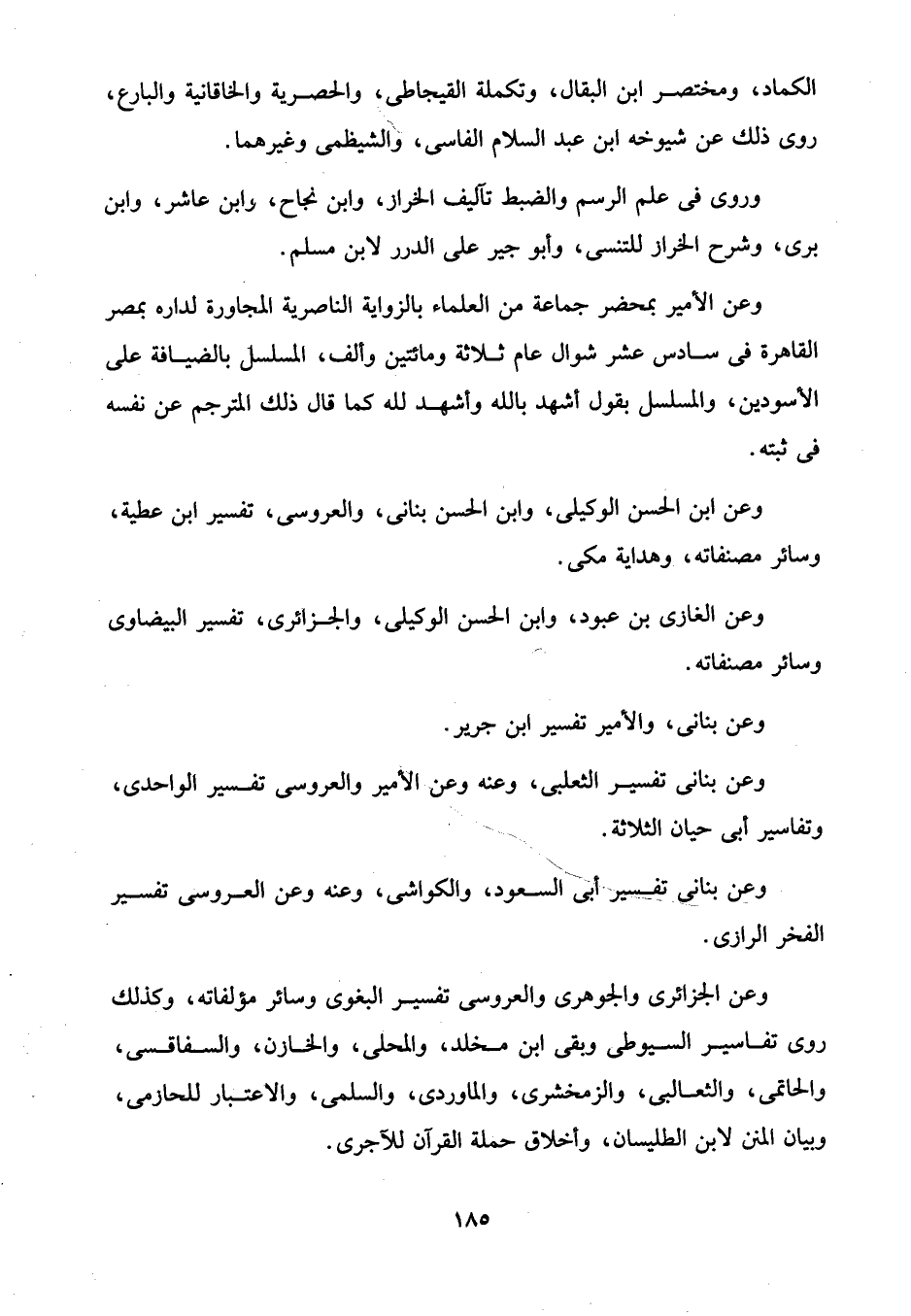 وعن ابن الحسن الوكيلى، وابن الحسن بنانى، والعروسى، تفسير ابن عطية، وسائر مصنفاته، وهداية مكى.