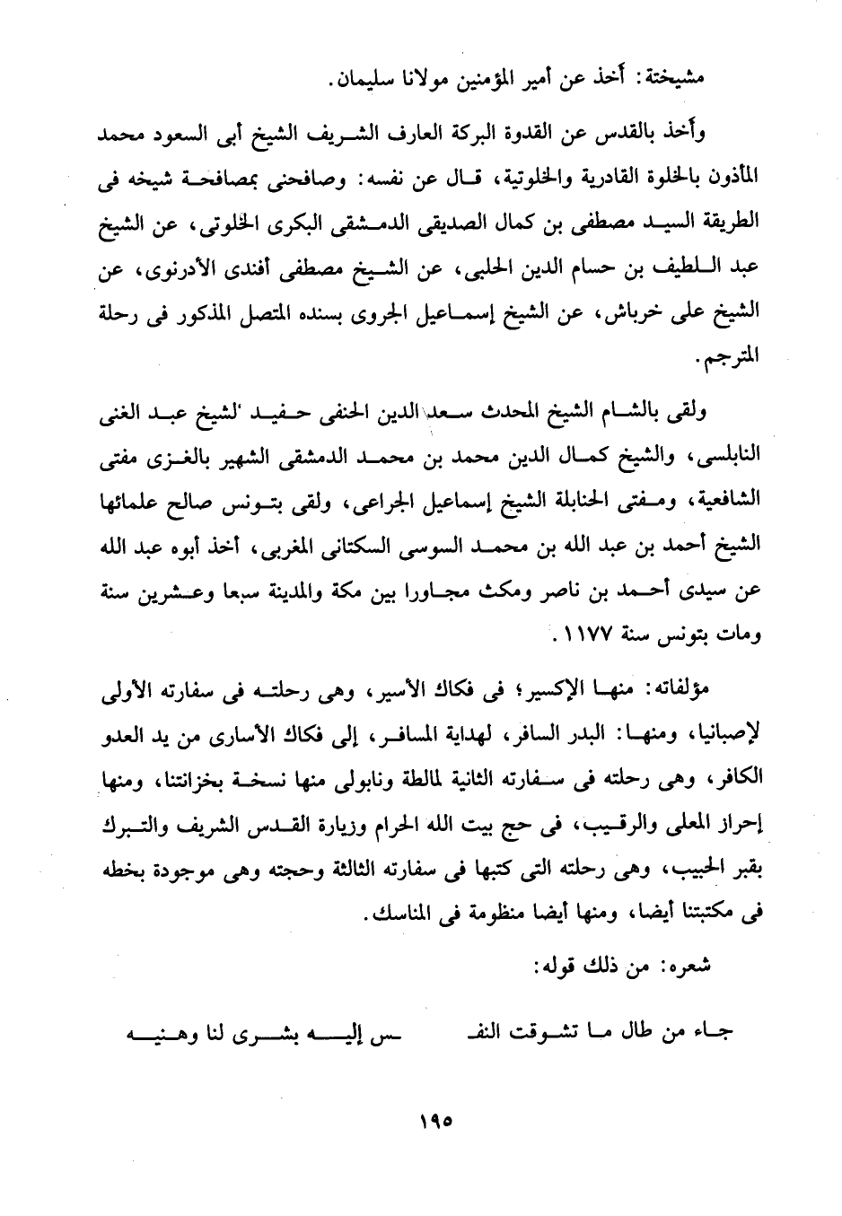 ولقى بالشام الشيخ المحدث سعد الدين الحنفى حفيد الشيخ عبد الغنى النابلسى، والشيخ كمال الدين محمد بن محمد الدمشقي الشهير بالغزى مفتى الشافعية، ومفتى الحنابلة الشيخ إسماعيل الجراعى، ولقى بتونس صالح علمائها الشيخ أحمد بن عبد الله بن محمد السوسى السكتانى المغربى، أخذ أبوه عبد الله عن سيدي أحمد بن ناصر ومكث مجاورا بين مكة والمدينة سبعا وعشرين سنة ومات بتونس سنة 1177.