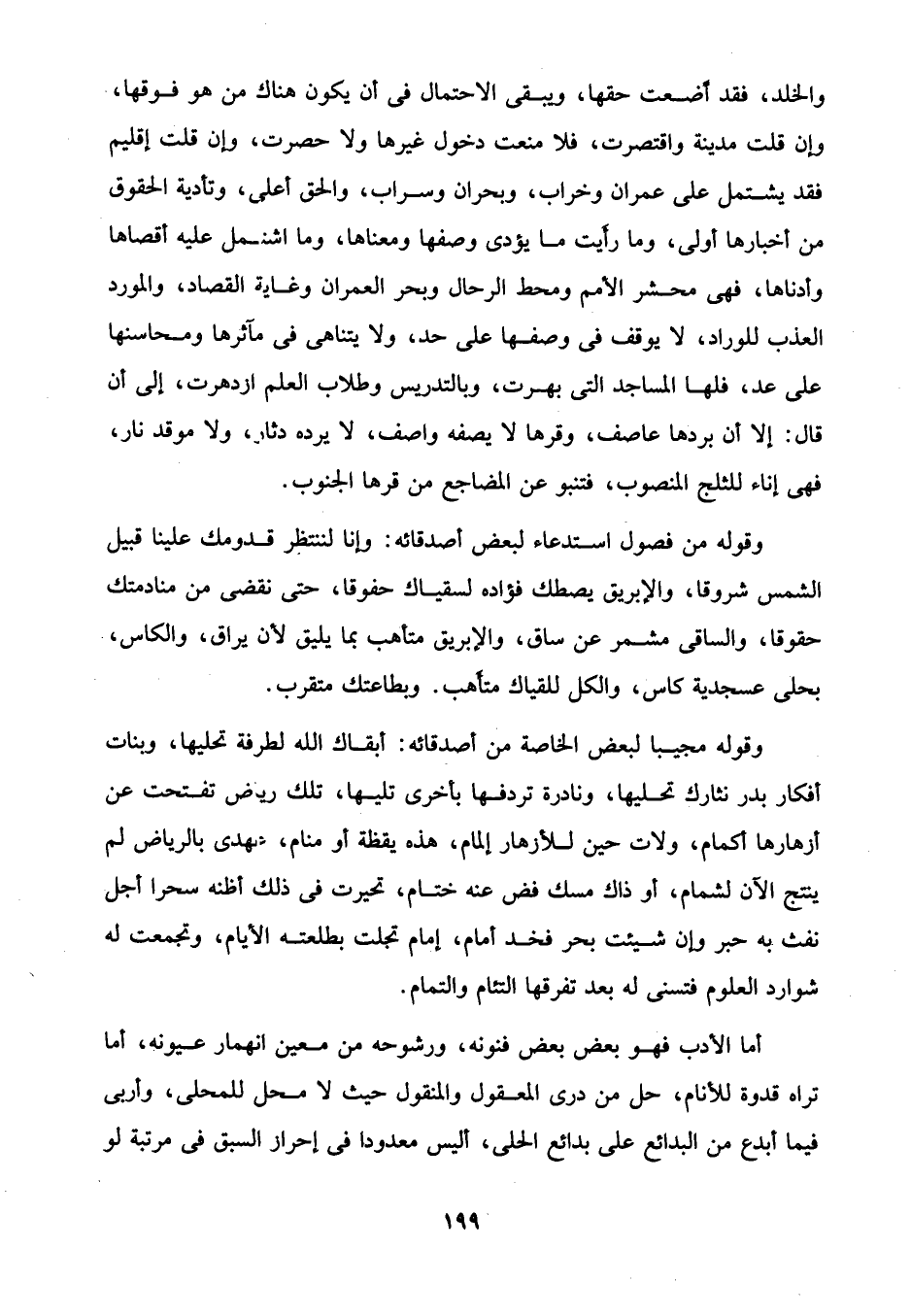 والخلد، فقد أضعت حقها، ويبقى الاحتمال في أن يكون هناك من هو فوقها، وإن قلت مدينة واقتصرت، فلا منعت دخول غيرها ولا حصرت، وإن قلت إقليم فقد يشتمل على عمران وخراب، وبحران وسراب، والحق أعلى، وتأدية الحقوق من أخبارها أولى، وما رأيت ما يؤدى وصفها ومعناها، وما اشتمل عليه أقصاها وأدناها، فهي محشر الأمم ومحط الرحال وبحر العمران وغاية القصاد، والمورد العذب للوراد، لا يوقف في وصفها على حد، ولا يتناهى في مآثرها ومحاسنها على عد، فلها المساجد التي بهرت، وبالتدريس وطلاب العلم ازدهرت، إلى أن قال: إلا أن بردها عاصف، وقرها لا يصفه واصف، لا يرده دثار، ولا موقد نار، فهي إناء للثلج المنصوب، فتنبو عن المضاجع من قرها الجنوب.
