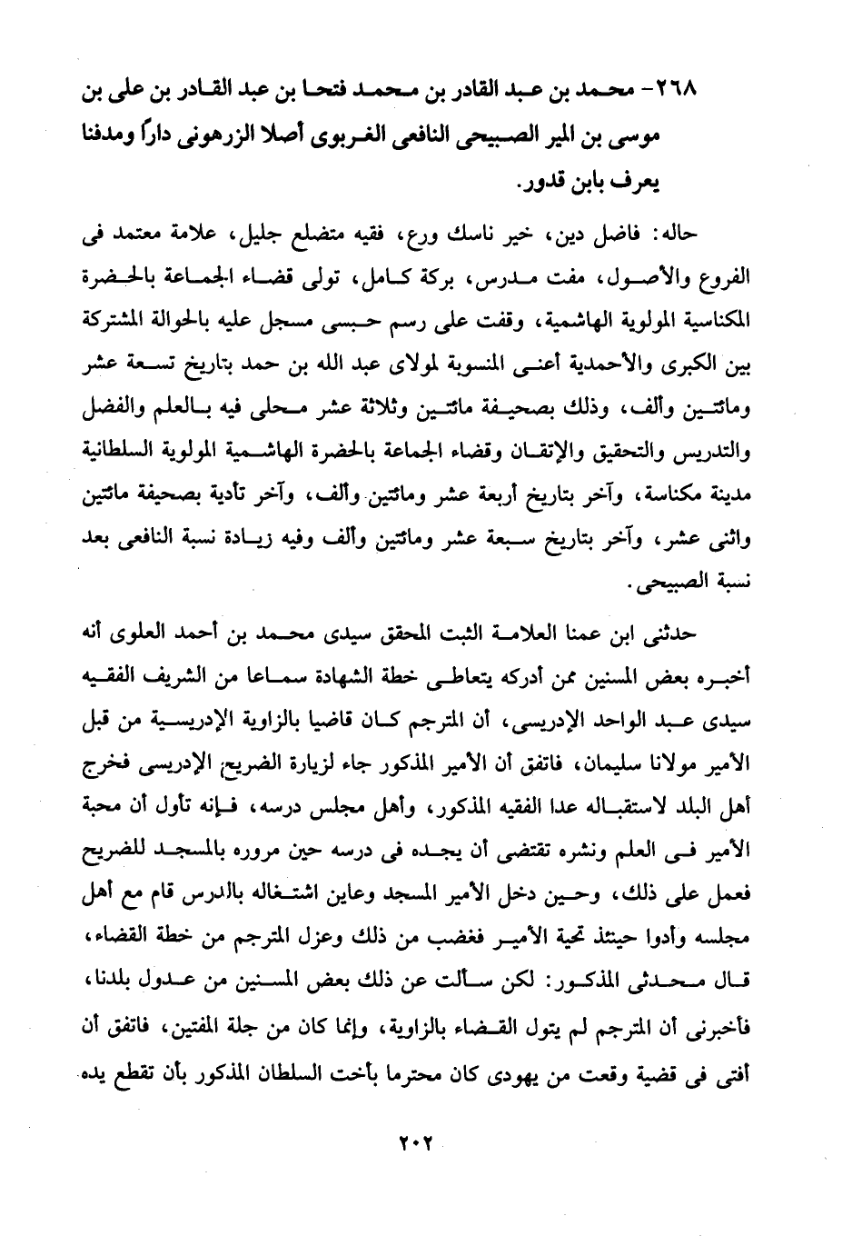 268 - محمد بن عبد القادر بن محمد فتحا بن عبد القادر بن على بن موسى بن المير الصبيحى النافعى الغربوى أصلا الزرهونى داراً ومدفنا يعرف بابن قدور.