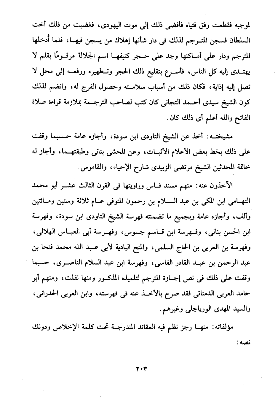 لموجبه فقطعت وفق فتياه فأفضى ذلك إلى موت اليهودى، فغضبت من ذلك أخت السلطان فسجن المترجم لذلك في دار شأنها إهلاك من يسجن فيها، فلما أُدخلها المترجم ودار على أماكنها وجد على حجر كنيفها اسم الجلالة مرقومًا بقلم لا يهتدى إليه كل الناس، فأسرع بتقليع ذلك الحجر وتطهيره ورفعه إلى محل لا تصل إليه إذاية، فكان ذلك من أسباب سلامته وحصول الفرج له، وانضم لذلك كون الشيخ سيدي أحمد التجانى كان كتب لصاحب الترجمة بملازمة قراءة صلاة الفاتح والله أعلم أي ذلك كان.