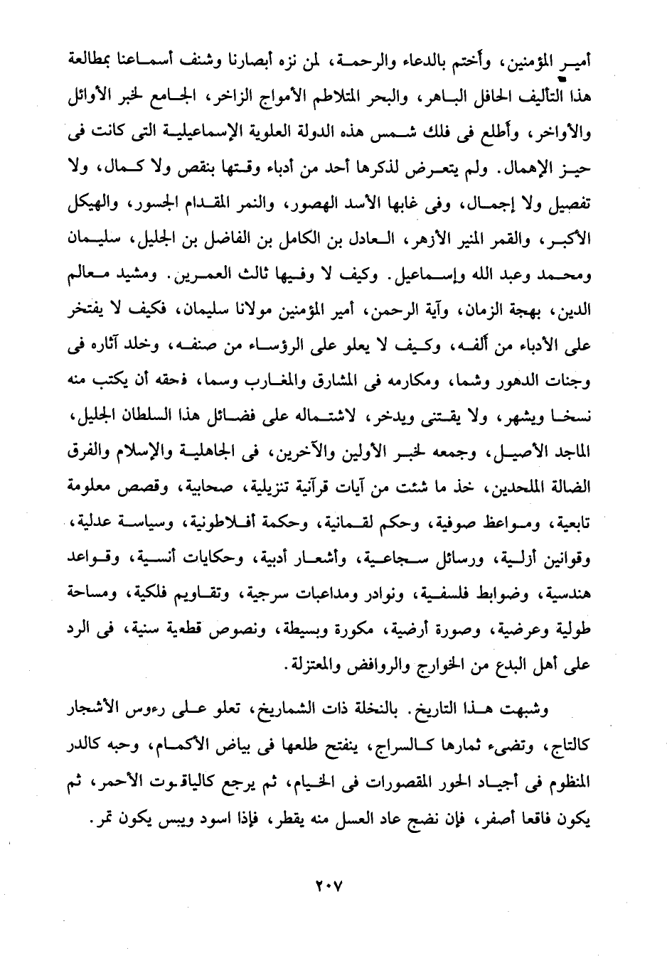 أمير المؤمنين، وأختم بالدعاء والرحمة، لمن نزه أبصارنا وشنف أسماعنا بمطالعة هذا التأليف الحافل الباهر، والبحر المتلاطم الأمواج الزاخر، الجامع لخبر الأوائل والأواخر، وأطلع في ذلك شمس هذه الدولة العلوية الإسماعيلية التي كانت في حيز الإهمال. ولم يتعرض لذكرها أحد من أدباء وقتها بنقص ولا كمال، ولا تفصيل ولا إجمال، وفي غابها الأسد الهصور، والنمر المقدام الجسور، والهيكل الأكبر، والقمر المنير الأزهر، العادل بن الكامل بن الفاضل بن الجليل، سليمان ومحمد وعبد الله وإسماعيل. وكيف لا وفيها ثالث العمرين. ومشيد معالم الدين، بهجة الزمان، وآية الرحمن، أمير المؤمنين مولانا سليمان، فكيف لا يفتخر على الأدباء من ألفه، وكيف لا يعلو على الرؤساء من صنفه، وخلد آثاره في وجنات الدهور وشما، ومكارمه في المشارق والمغارب وسما، فحقه أن يكتب منه نسخا ويشهر، ولا يقتنى ويدخر، لاشتماله على فضائل هذا السلطان الجليل، الماجد الأصيل، وجمعه لخبر الأولين والآخرين، في الجاهلية والإِسلام والفرق الضالة الملحدين، خذ ما شئت من آيات قرآنية تنزيلية، صحابية، وقصص معلومة تابعية، ومواعظ صوفية، وحكم لقمانية، وحكمة أفلاطونية، وسياسة عدلية، وقوانين أزلية، ورسائل سجاعية، وأشعار أدبية، وحكايات أنسية، وقواعد هندسية، وضوابط فلسفية، ونوادر ومداعبات سرجية، وتقاويم فلكية، ومساحة طولية وعرضية، وصورة أرضية، مكورة وبسيطة، ونصوص قطعية سنية، في الرد على أهل البدع من الخوارج والروافض والمعتزلة.