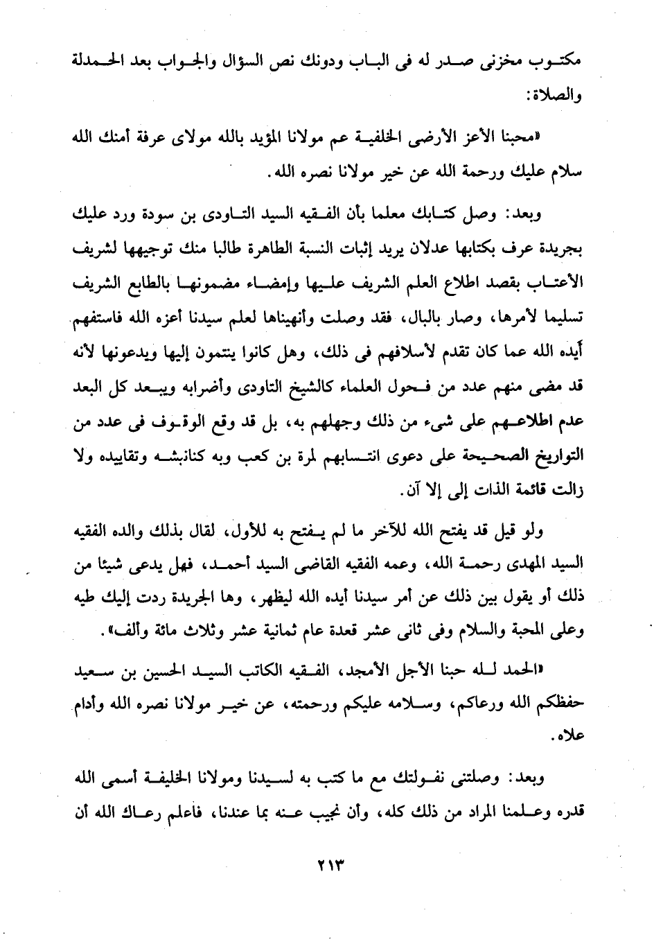 وبعد: وصل كتابك معلما بأن الفقيه السيد التاودى بن سودة ورد عليك بجريدة عرف بكتابها عدلان يريد إثبات النسبة الطاهرة طالبا منك توجيهها لشريف الأعتاب بقصد اطلاع العلم الشريف عليها وإمضاء مضمونها بالطابع الشريف تسليما لأمرها، وصار بالبال، فقد وصلت وأنهيناها لعلم سيدنا أعزه الله فاستفهم. أيده الله عما كان تقدم لأسلافهم في ذلك، وهل كانوا ينتمون إليها ويدعونها لأنه قد مضى منهم عدد من فحول العلماء كالشيخ التاودى وأضرابه ويبعد كل البعد عدم اطلاعهم على شيء من ذلك وجهلهم به، بل قد وقع الوقوف في عدد من التواريخ الصحيحة على دعوى انتسابهم لمرة بن كعب وبه كنانبشه وتقاييده ولا زالت قائمة الذات إلى إلا آن.
