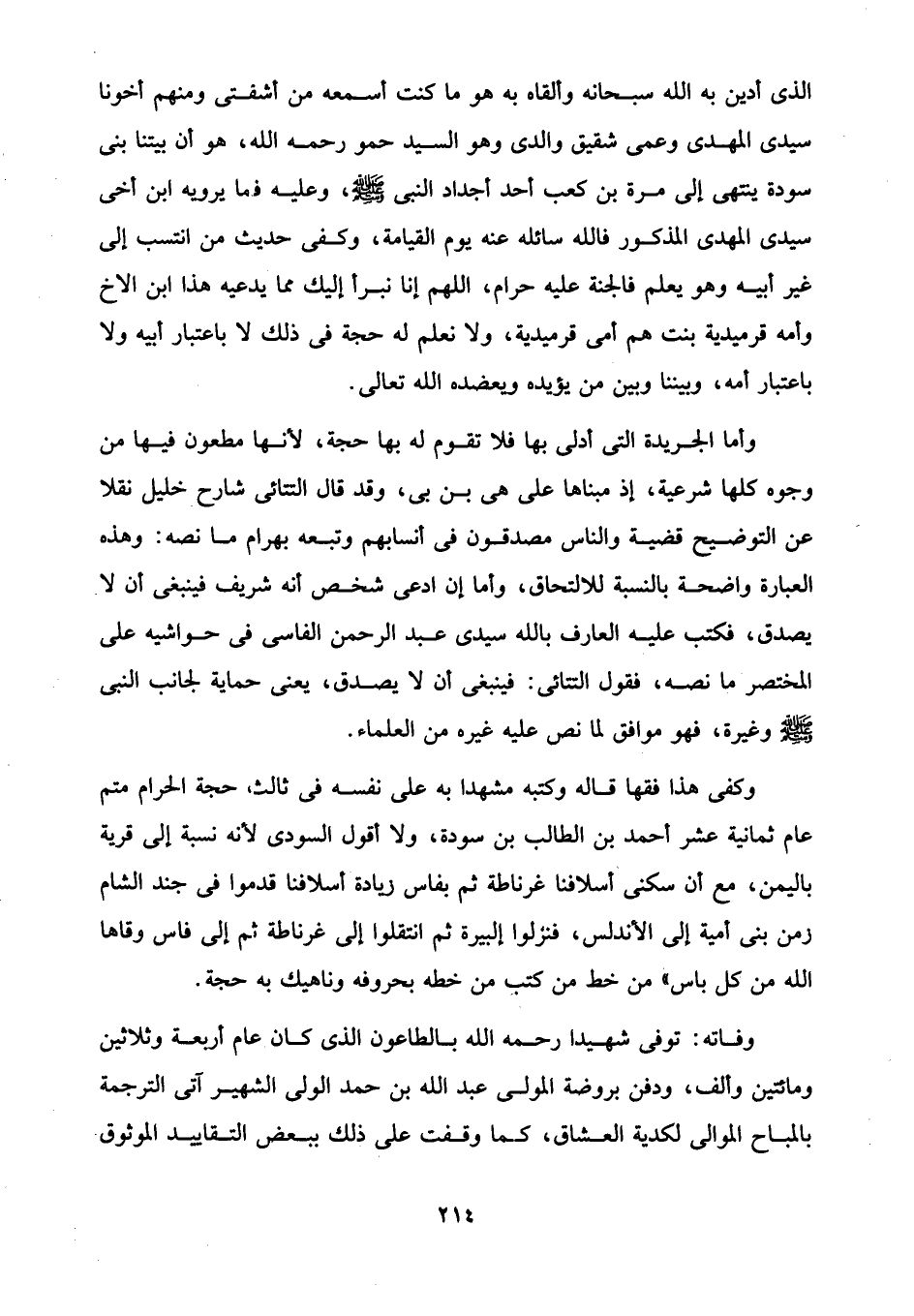 وأما الجريدة التي أدلى بها فلا تقوم له بها حجة، لأنها مطعون فيها من وجوه كلها شرعية، إذ مبناها على هى بن بى، وقد قال التتائى شارح خليل نقلا عن التوضيح قضية والناس مصدقون في أنسابهم وتبعه بهرام ما نصه: وهذه العبارة واضحة بالنسبة للالتحاق، وأما إن ادعى شخص أنه شريف فينبغى أن لا يصدق، فكتب عليه العارف بالله سيدي عبد الرحمن الفاسى في حواشيه على المختصر ما نصه، فقول التتائى: فينبغى أن لا يصدق، يعني حماية لجانب النبي -صلى الله عليه وسلم- وغيرة، فهو موافق لما نص عليه غيره من العلماء.