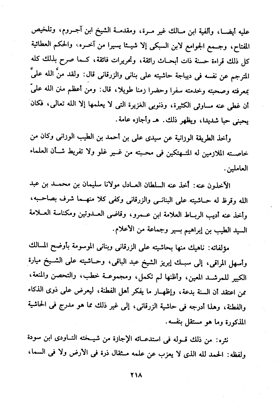 عليه أيضًا، وألفية ابن مالك غير مرة، ومقدمة الشيخ ابن آجروم، وتلخيص المفتاح، وجمع الجوامع لابن السبكى إلا شيئا يسيرا من آخره، والحكم العطائية كل ذلك قراءة حسنة ذات أبحاث رائقة، وتحريرات فائقة، كما صرح بذلك كله المترجم عن نفسه في ديباجة حاشيته على بنانى والزرقانى قال: ولقد منَّ الله علىَّ بمعرفته وصحبته وخدمته سفرا وحضرا زمنا طويلا، قال: ومن أعظم منن الله علىّ أن غطى عنه مساوئى الكثيرة، وذنوبى الغزيرة التي لا يعلمها إلا الله تعالى، فكان يحبنى حبا شديداً، ويظهر ذلك. هـ وأجازه عامة.