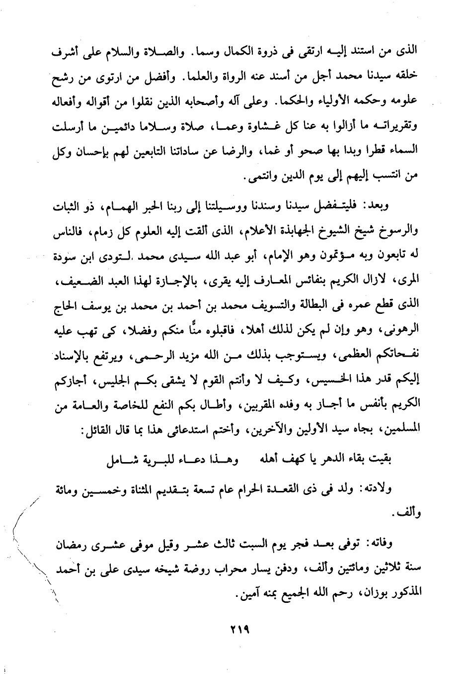 وفاته: توفي بعد فجر يوم السبت ثالث عشر وقيل موفى عشرى رمضان سنة ثلاثين ومائتين وألف، ودفن يسار محراب روضة شيخه سيدي على بن أحمد المذكور بوزان، رحم الله الجميع بمنه آمين.